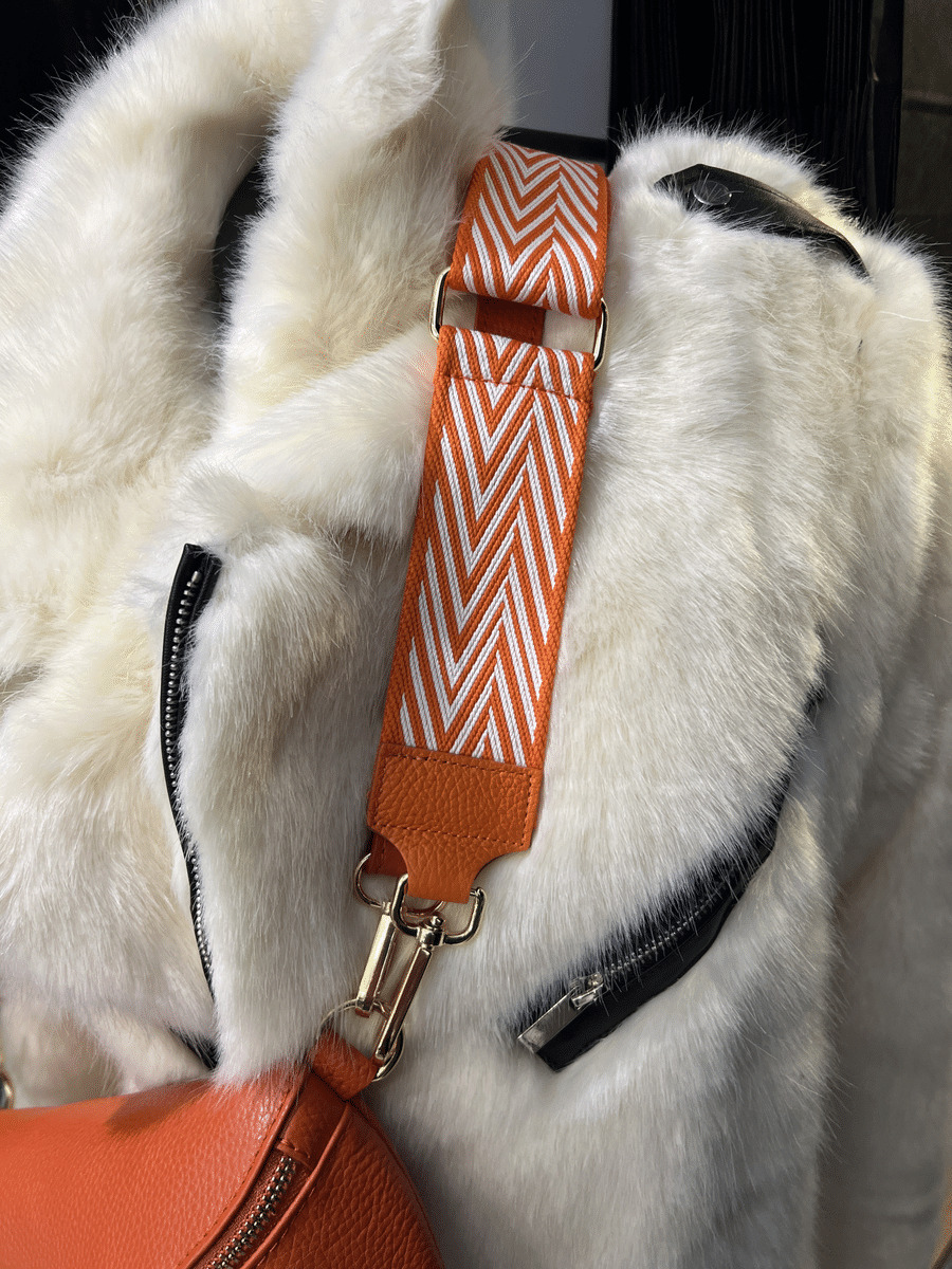 Bandoulière matière tissus au motif géométrique avec embout finition cuir