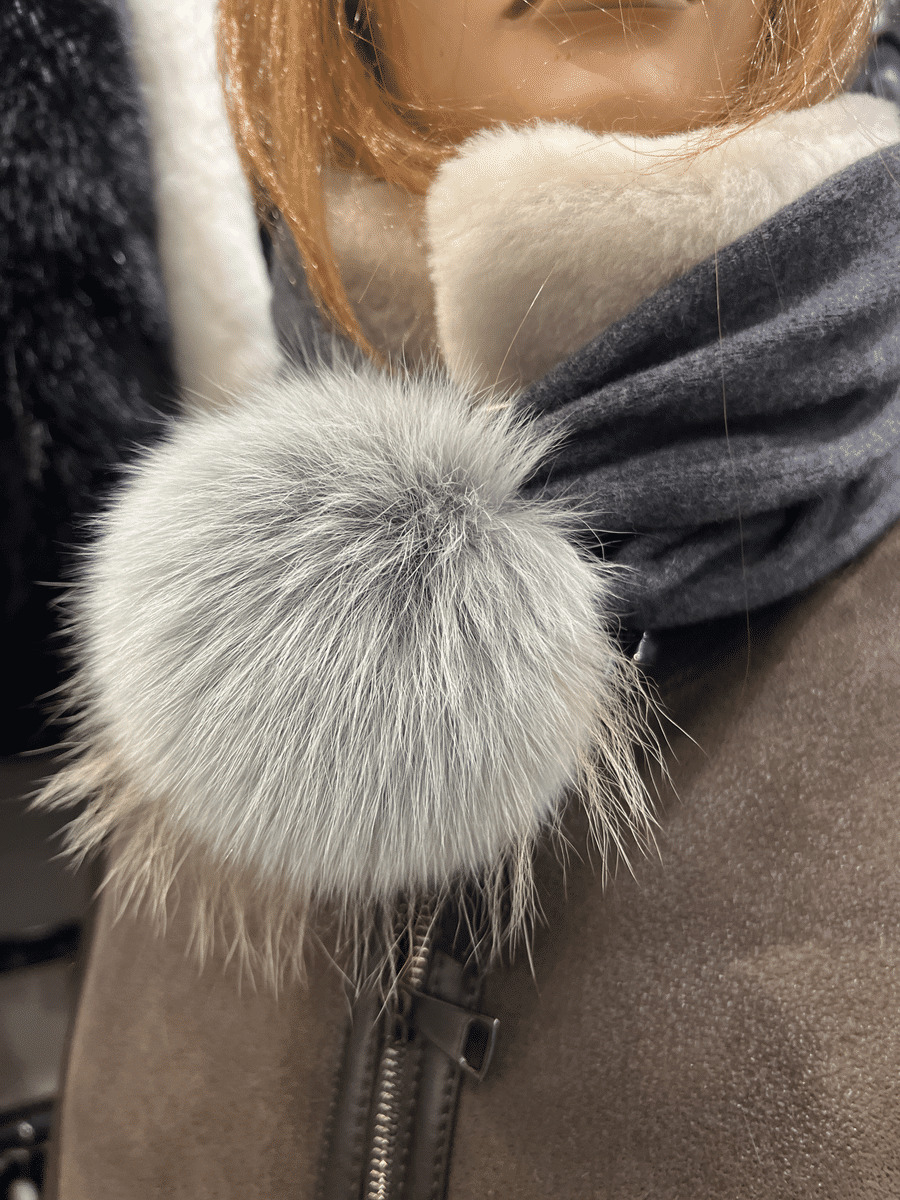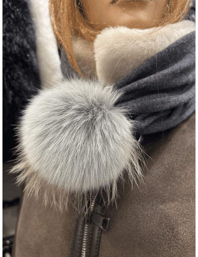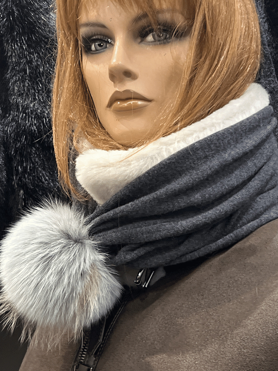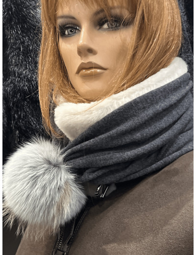 Bonnet femme matière cachemire et laine coloris gris pompon renard. le bonnet peut également faire un tour de coup