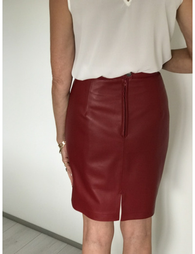 Jupe droite, cuir agneau, doublure polyester, montée sur ceinture, coloris rouge, fente dos