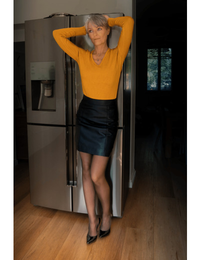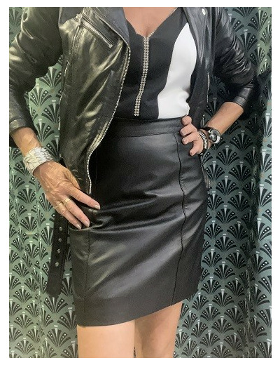 Jupe droite cuir agneau coloris bleu électrique, noir