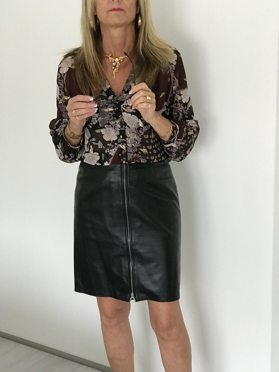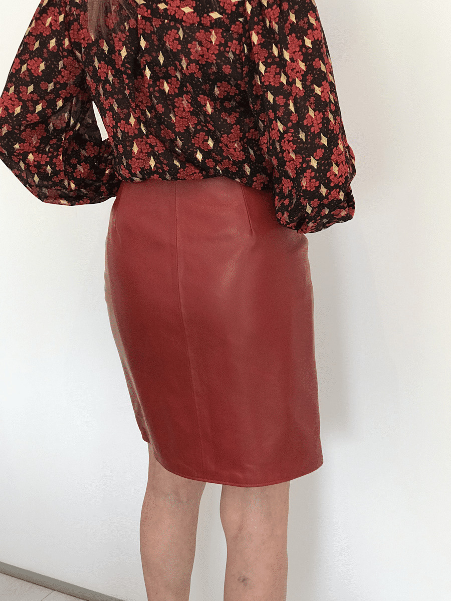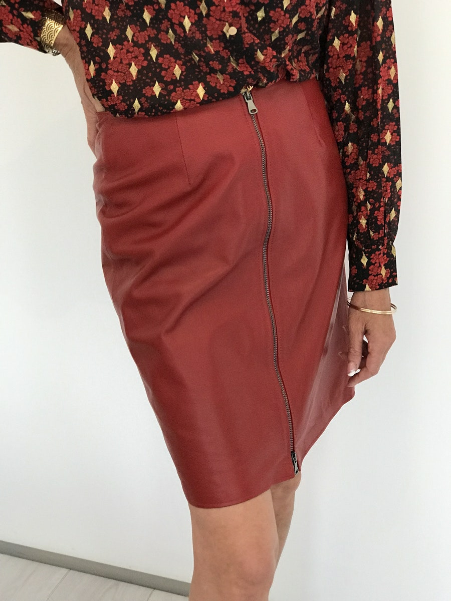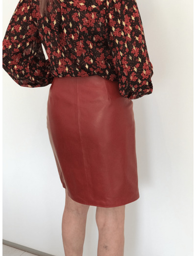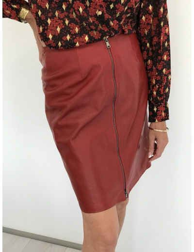Jupe cuir agneau, fermeture zip, doublure polyester, coloris rouge et noir