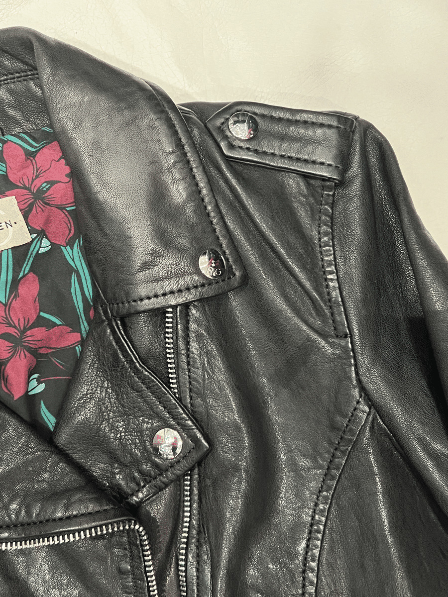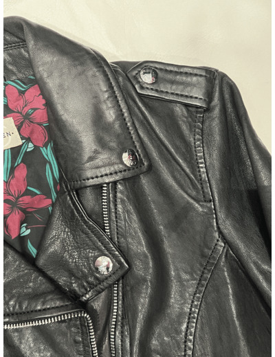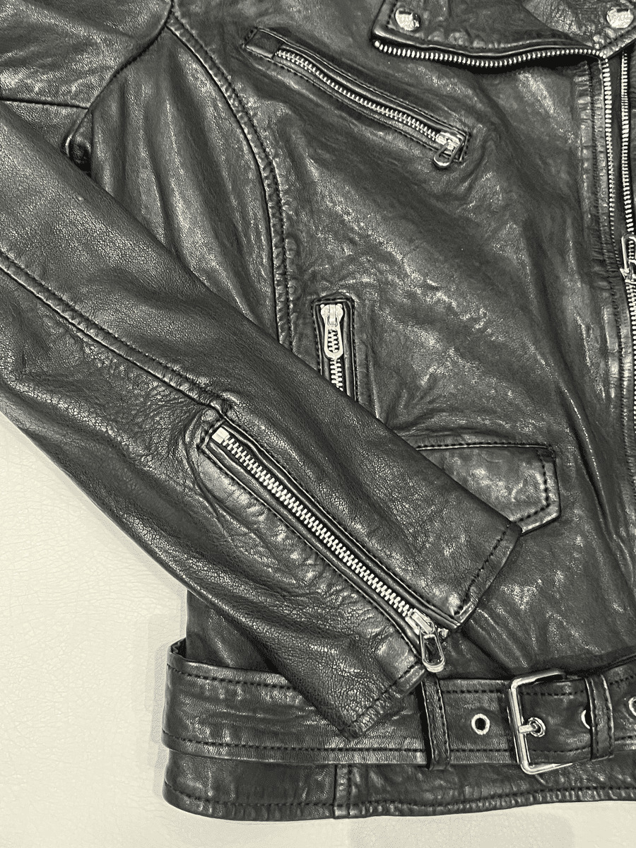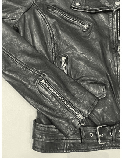 Blousons femme biker fabriqués en cuir d'agneau au tannage 100% végétal. Le perfecto se caractérise parmis les détails comme la fermeture zippée asymétrique, les pattes d'épaule et la ceinture à la taille avec boucle de serrage.