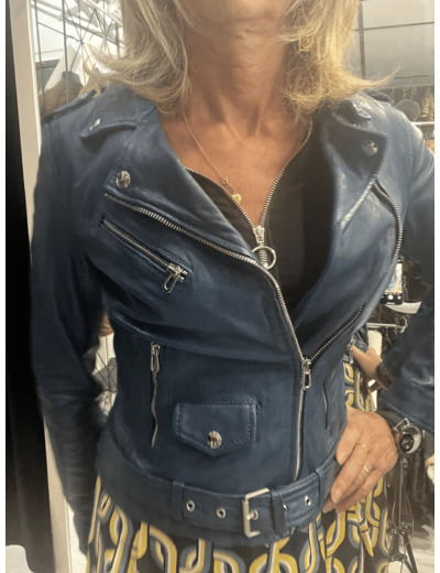 Blousons femme biker fabriqués en cuir d'agneau au tannage 100% végétal. Le perfecto se caractérise parmis les détails comme la fermeture zippée asymétrique, les pattes d'épaule et la ceinture à la taille avec boucle de serrage.