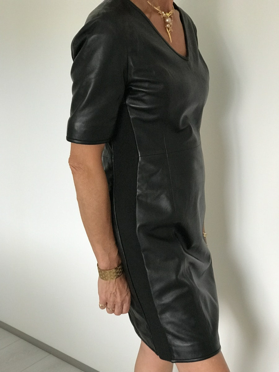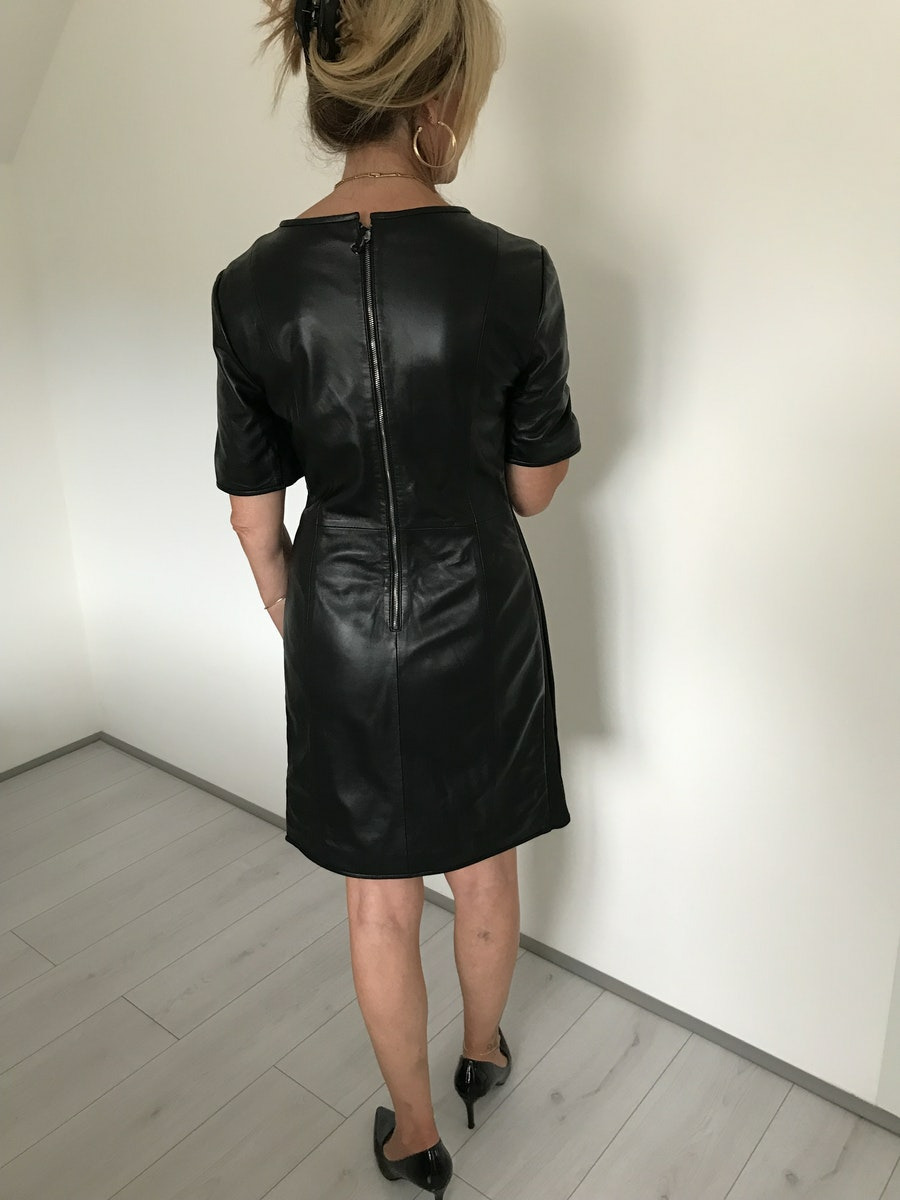 Robe cuir d'agneau, manches courtes, fermeture zip dos,col V, strech coté, coupe ajusté, couleur noir
