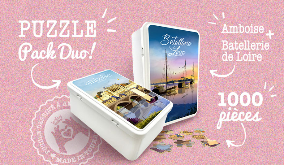 2 Puzzles de 1000 Pièces format 68x49 cm. Illustrations réalisées à la main en dessin vectoriel par le studio graphique de Antirouille Communication situé à AMBOISE. Puzzles Imprimés sur carton spécifique et livrés dans une boite métallique personnalisée. Nos petites séries sont ARTISANALES et 100 % MADE IN FRANCE.