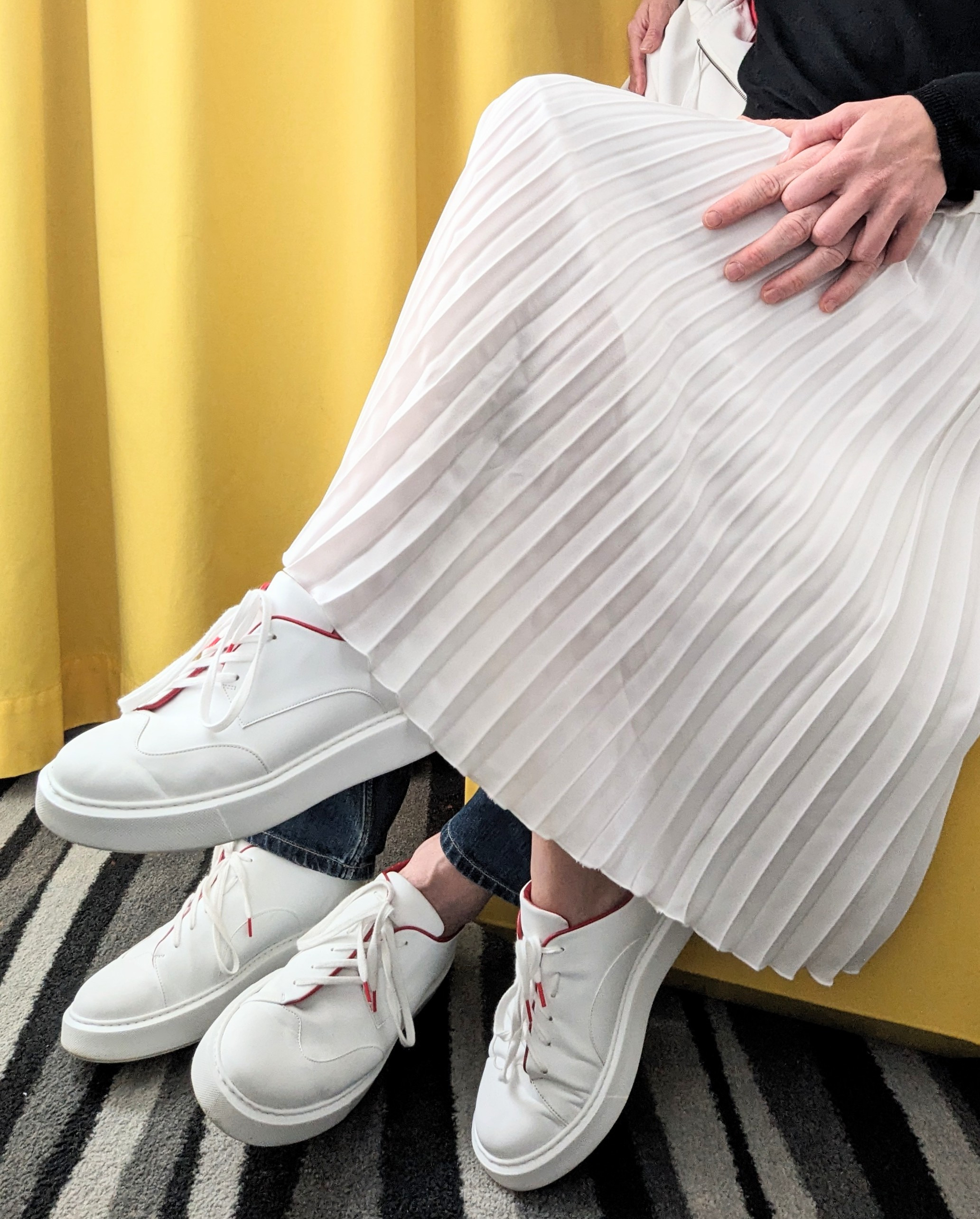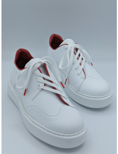 Sneaker asymétrique (modèle déposé), mi-Sneakers mi-Derbies, blanche à doublure rouge, en matériaux bio-sourcés contenant 70% de fibres de bambous et de maïs issues de l’industrie agro-alimentaire.