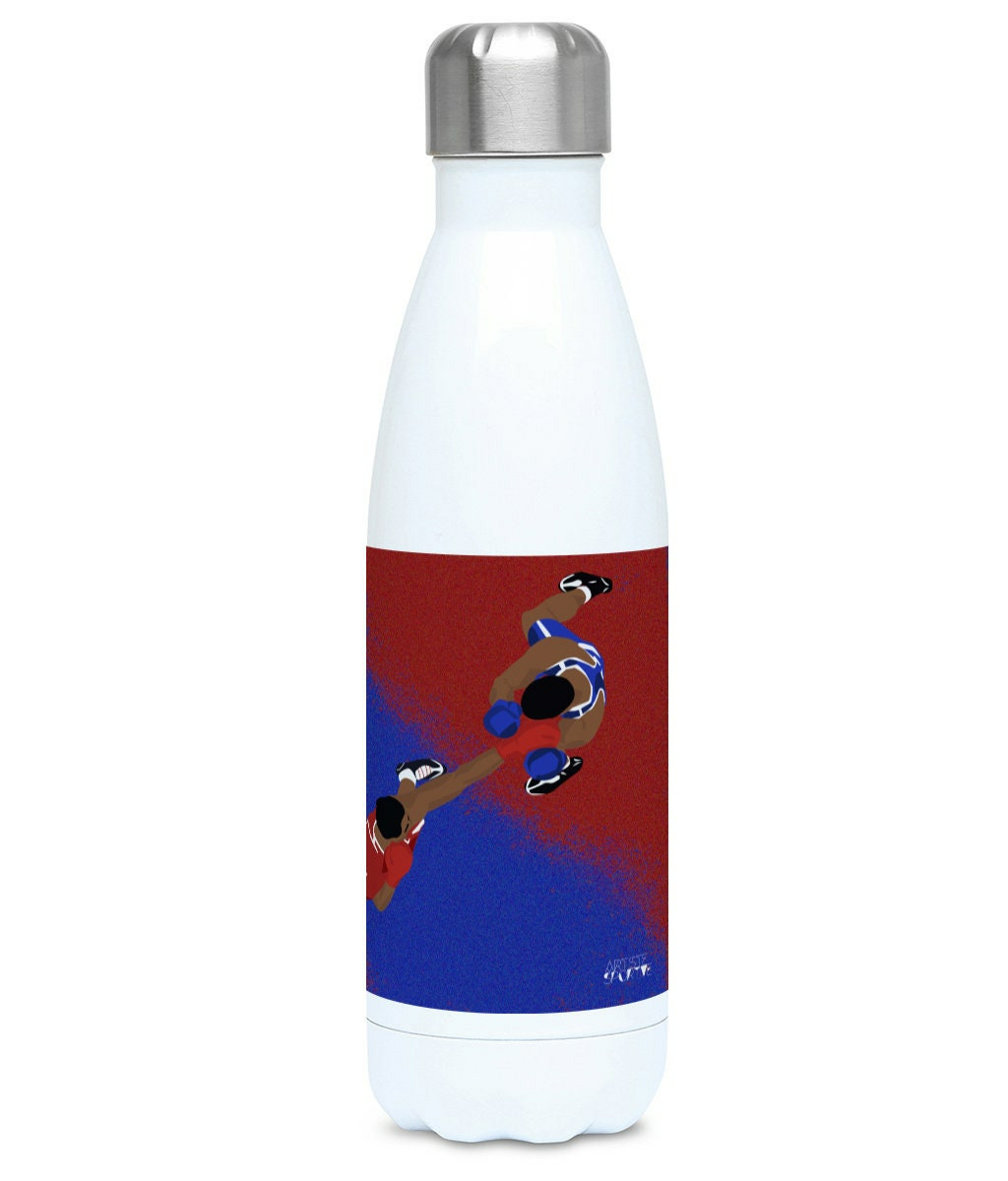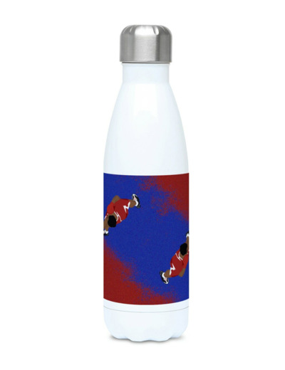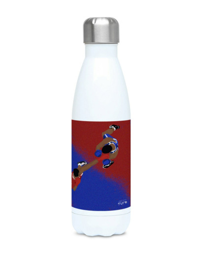 C'est une illustration que j'ai réalisée inspirée de ma propre pratique de la boxe. J'ai choisi les couleurs qui représentent le coin rouge et le coin bleu d'un ring de boxe. Parfait pour vos entraînements, vous pouvez personnaliser votre gourde en y ajoutant un prénom !
