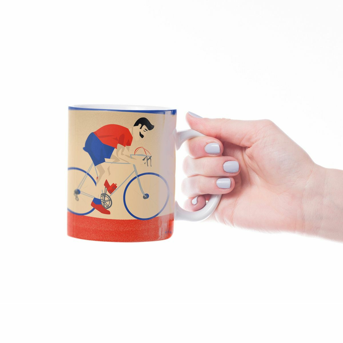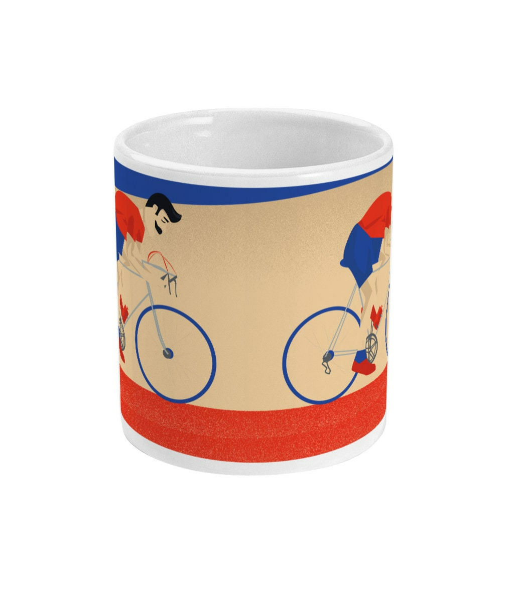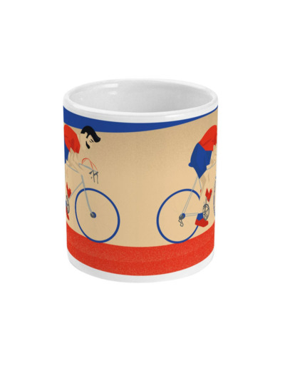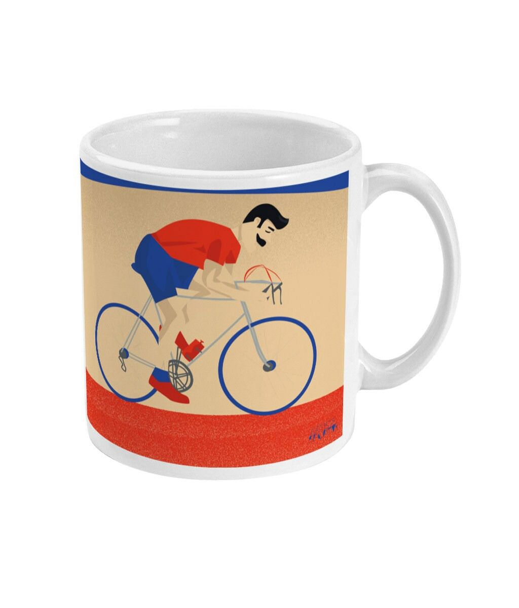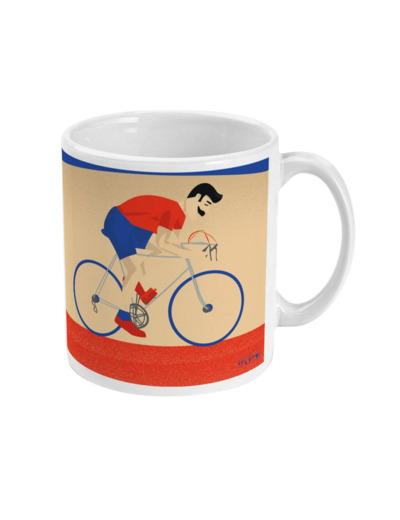 Tasse de Cyclisme : 'Monsieur Vélo'. C'est une illustration que j'ai réalisée inspiré par les vélos Peugeot et les fans du Tour de France. C'est un cadeau unique pour ceux et celles qui aiment le sport et le cyclisme: les cyclistes, les coachs de cyclismes, les fans de vélo et entraîneurs de cyclisme et clubs de cyclisme ou pour les sportifs et sportives qui aiment le cyclisme.