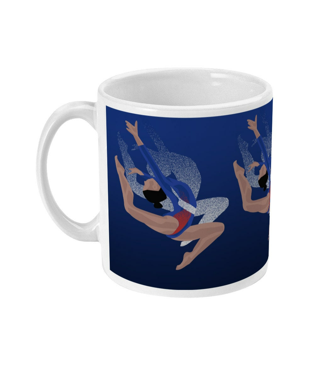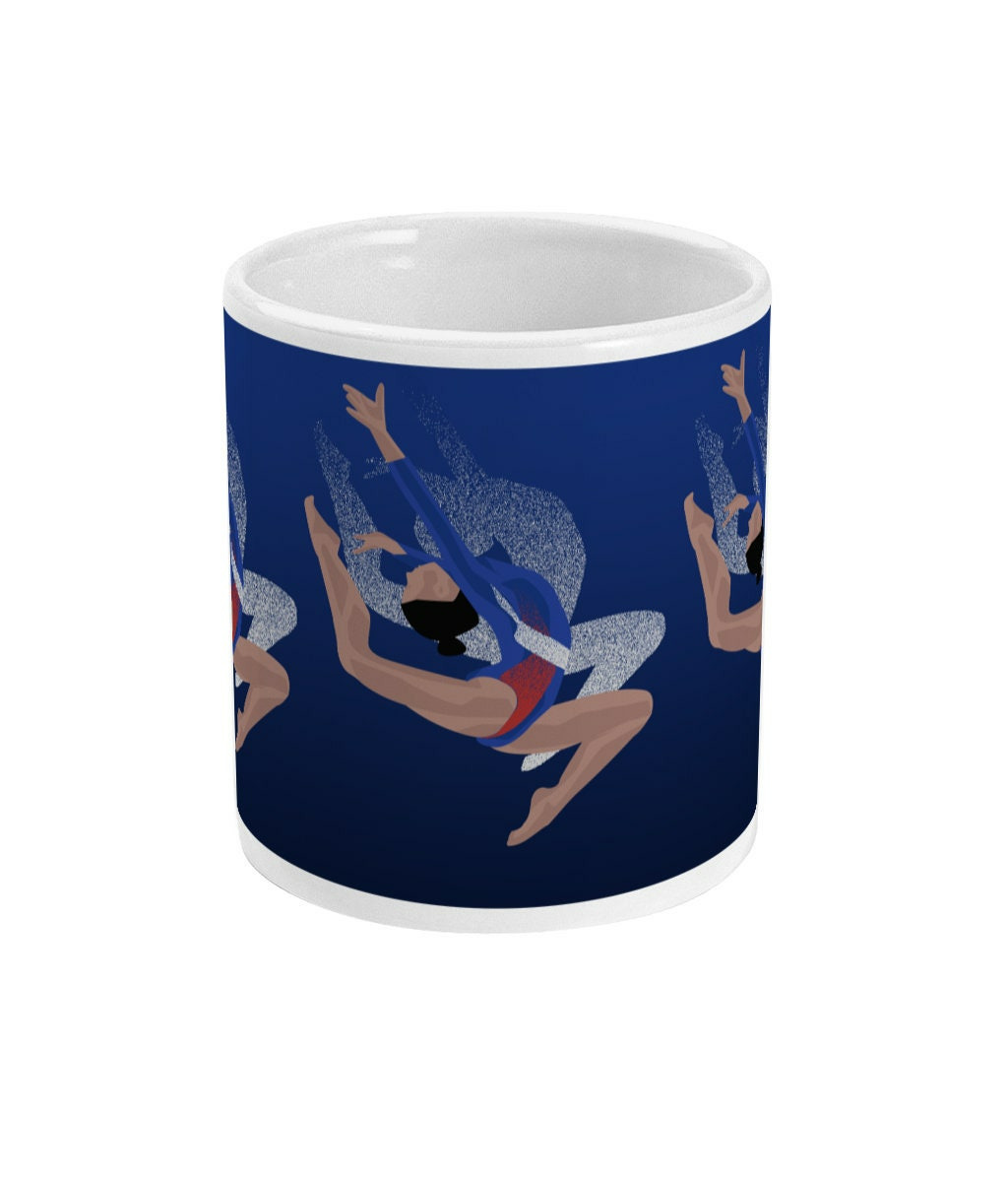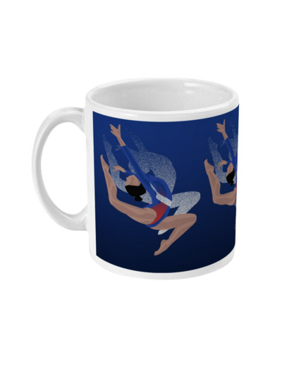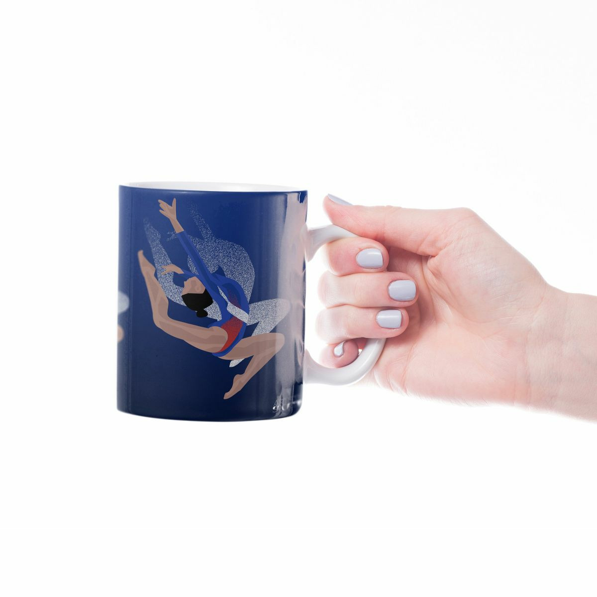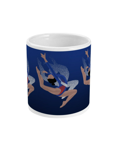 Tasse de gymnastique : 'Tatiana la gymnaste'. C'est une illustration inspirée par mon amie coach de gym. J'ai choisi de belles couleurs bleues et dynamiques. C'est un cadeau unique pour ceux et celles qui aiment le sport et la gymnastique: les gymnastes, les fans de gymnastique et entraîneurs de gymnastique et clubs et salles de gym ou pour les sportifs et sportives qui aiment la gymnastique.
