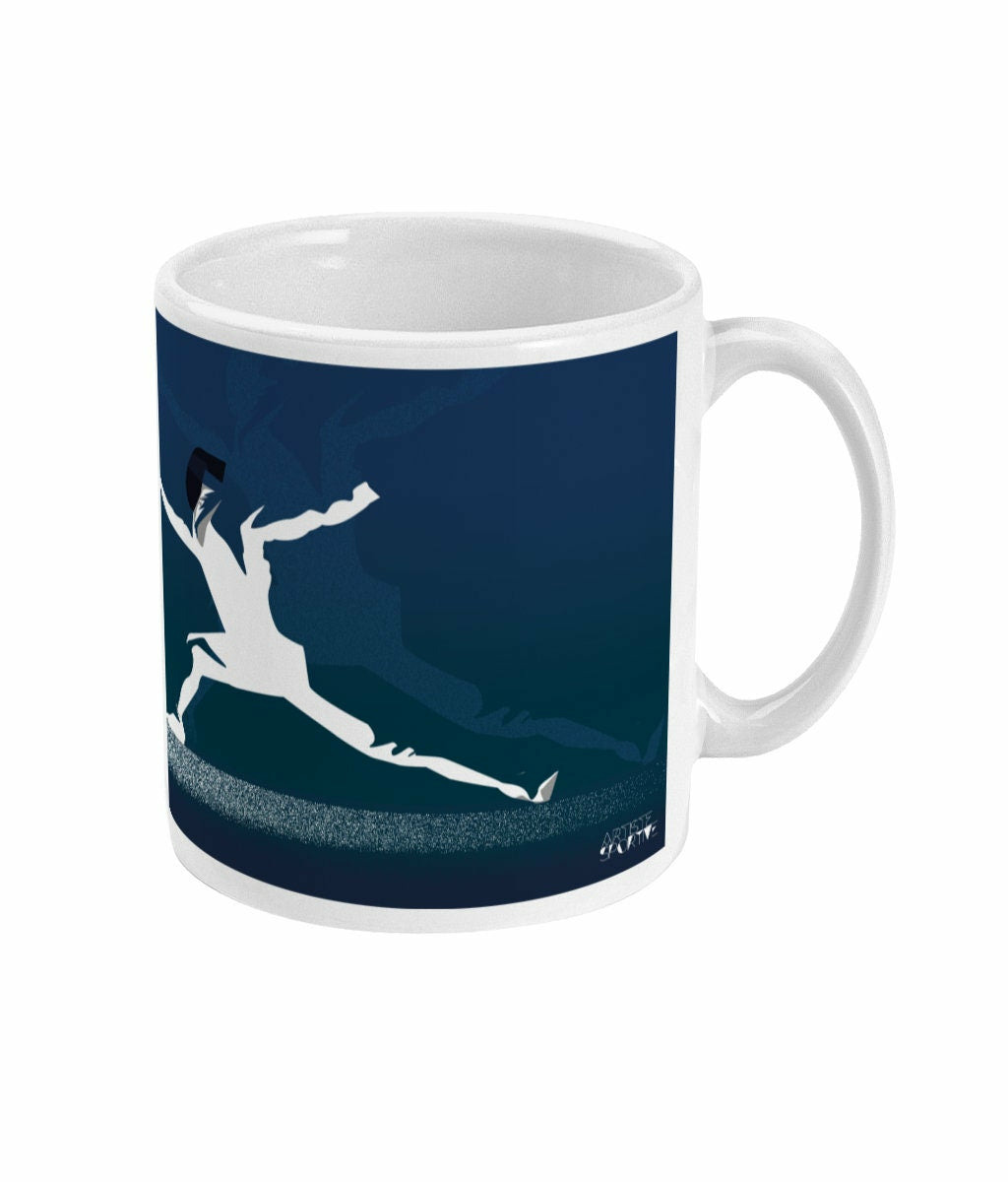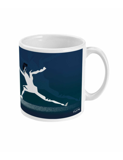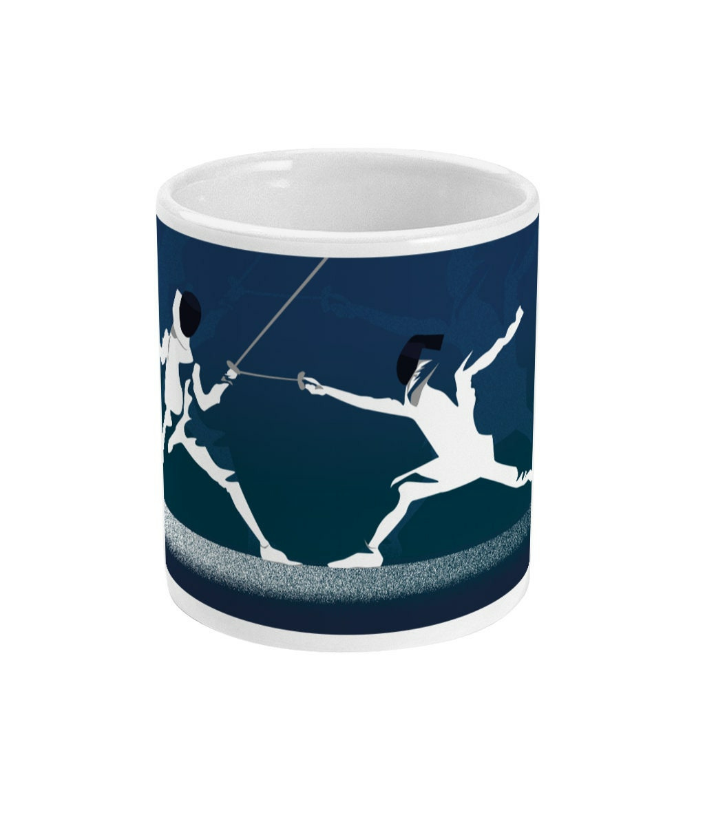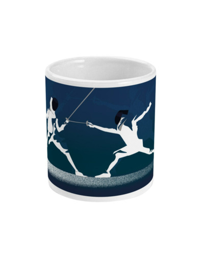 Tasse à personnaliser d'escrime : 'l'escrime en bleu'. C'est une illustration inspirée par avant l'art de l'escrime. C'est un cadeau unique pour ceux et celles qui aiment le sport et l'escrime: les escrimeurs, les escrimeuses, les fans de escrime et entraîneurs de escrime et clubs et salles d'escrime ou pour les sportifs et sportives qui aiment l'escrime.