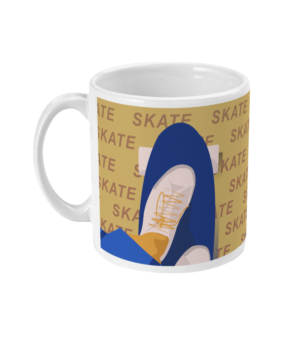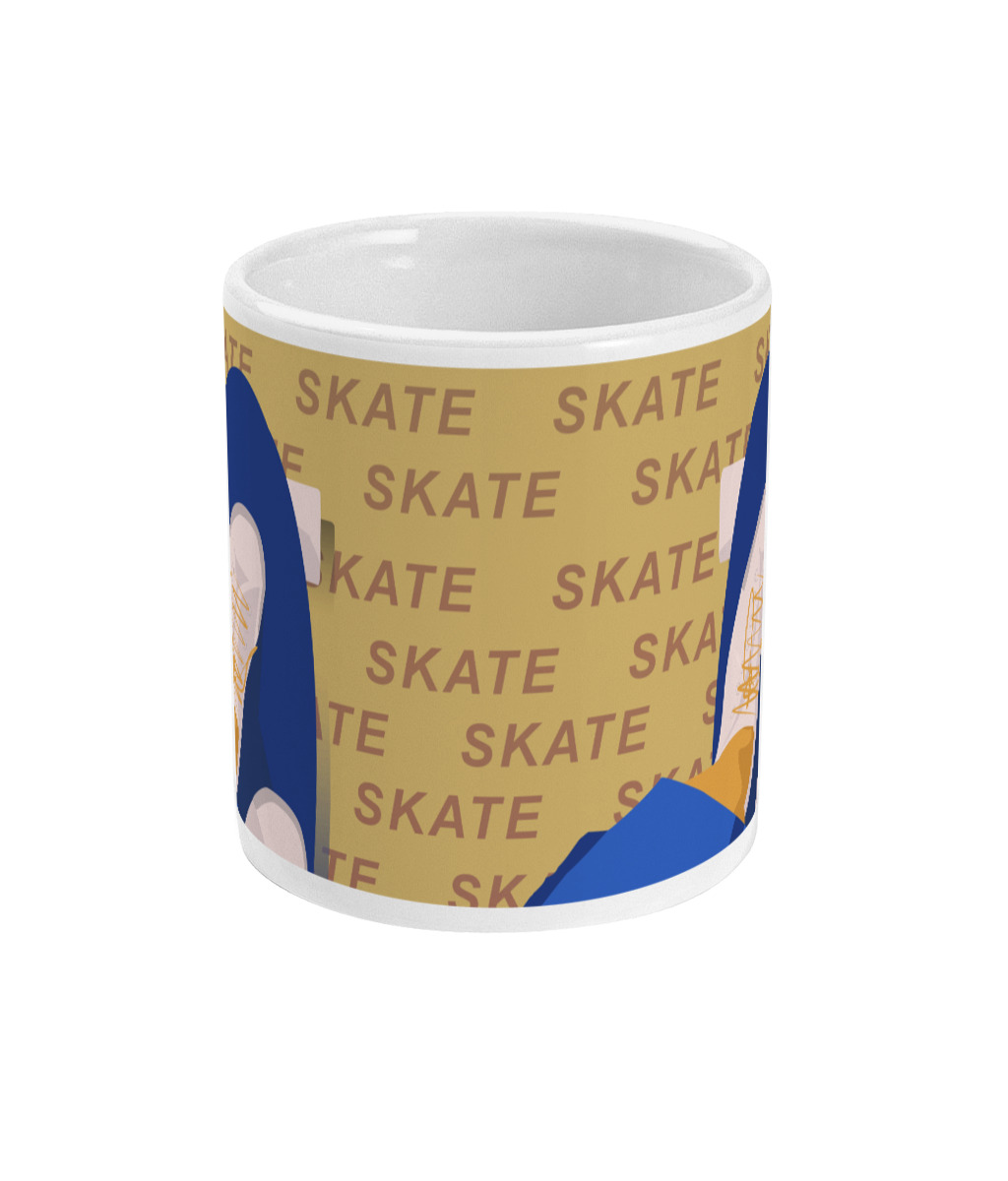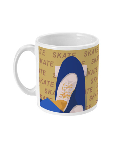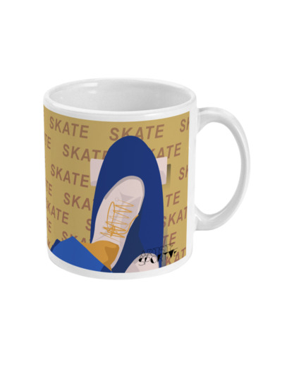 Tasse de Skate : 'skate en jaune'. C'est une illustration inspirée par ma filleule qui adore faire du skate. Je souhaitais faire une illustration moderne, cool et typographique. C'est un cadeau unique pour ceux et celles qui aiment le sport et le skate et le skateboard : les skateboarders, les skateurs, les skateuses, les fans de skate et entraîneurs de skate et clubs et salles de skate ou pour les sportifs et sportives qui aiment le skate.