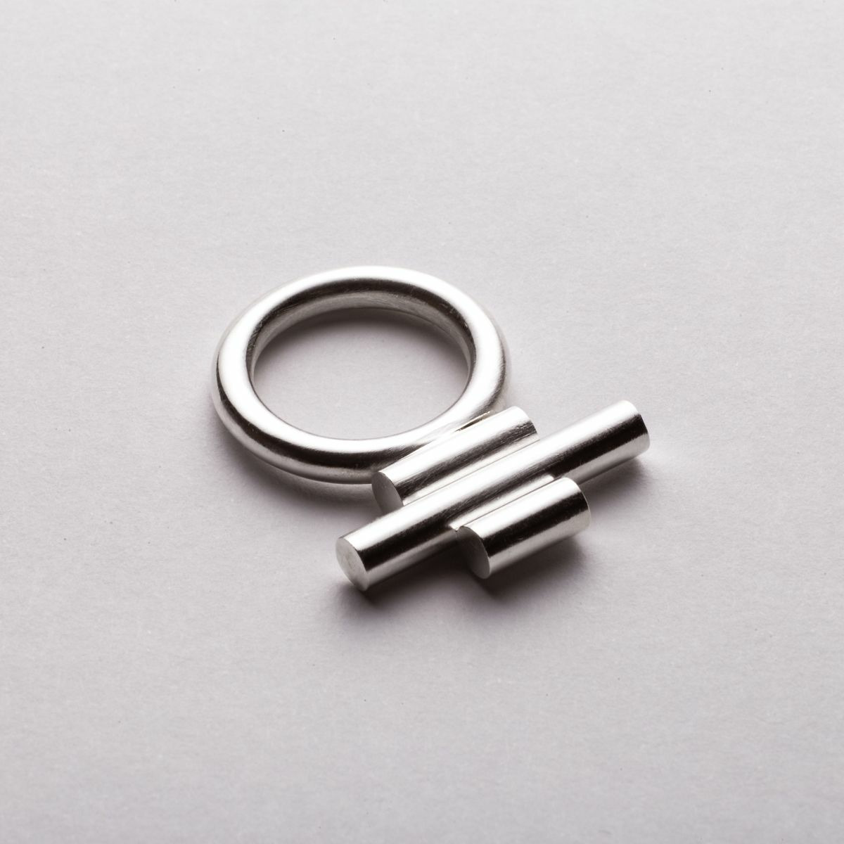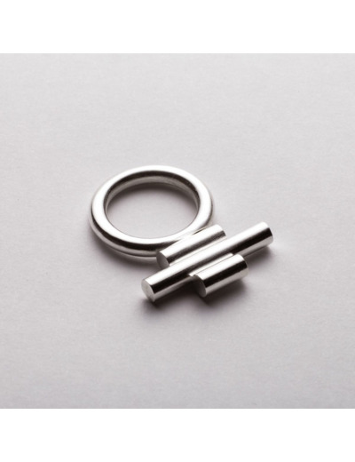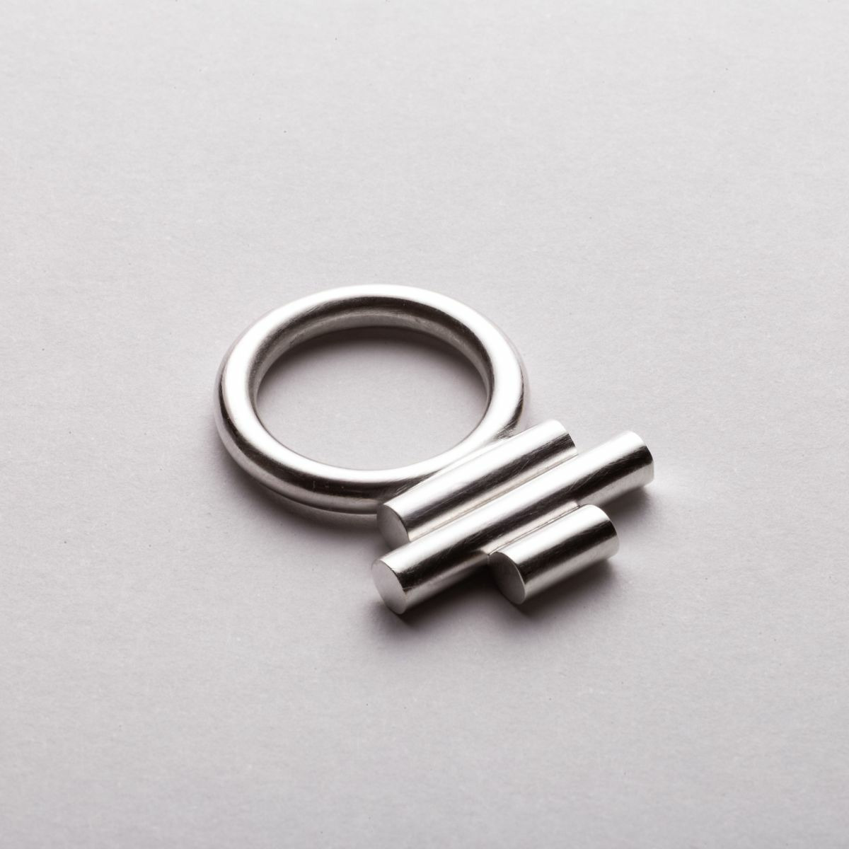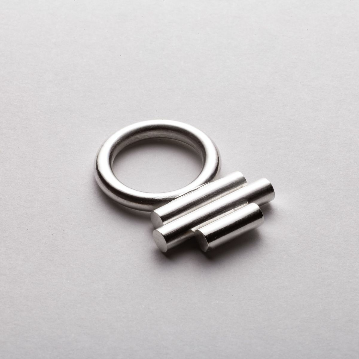 Bague entièrement brossée, composée d'un anneau de 3,5mm surplombée de trois cylindres de 4,5mm de diamètre.