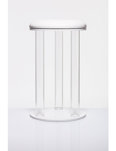Matériau : PMMA incolore avec une assise en cuir noir ou blanc