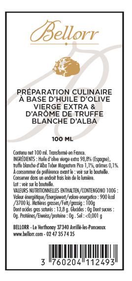 INGRÉDIENTS : Huile d'olive vierge extra origine Espagne (98.8%), truffes blanches d'Alba tuber magnatum Pico (1.1%), arômes 0.1%.