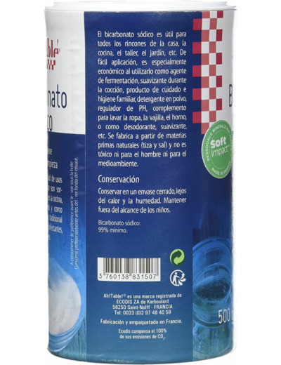 Le bicarbonate de sodium ou de soude (Na-HCO3) a de multiples qualités écologiques et est peu coûteux. La variété et la richesse de ses applications sont étonnantes. Le bicarbonate de soude peut ainsi remplacer de nombreux produits que vous payez si cher. Au lieu d’acheter poudre levant, produits anticalcaires, lessives chimiques, désodorisants et produits d’entretien. pensez donc au bicarbonate de soude. Agent nettoyant, adoucissant, abrasif, régulateur de pH, désodorisant, anticalcaire et adjuvant pour la cuisine. ses applications sont multiples. Bio Européen; Agriculture Biologique; Bio Vegan.