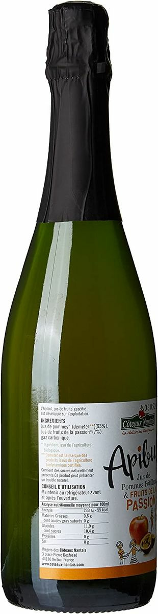 Jus de pommes 93 %, Jus de fruits de la passion 7 %, Gaz carbonique *. Tous nos ingrédients sont issus de l'agriculture biologique.