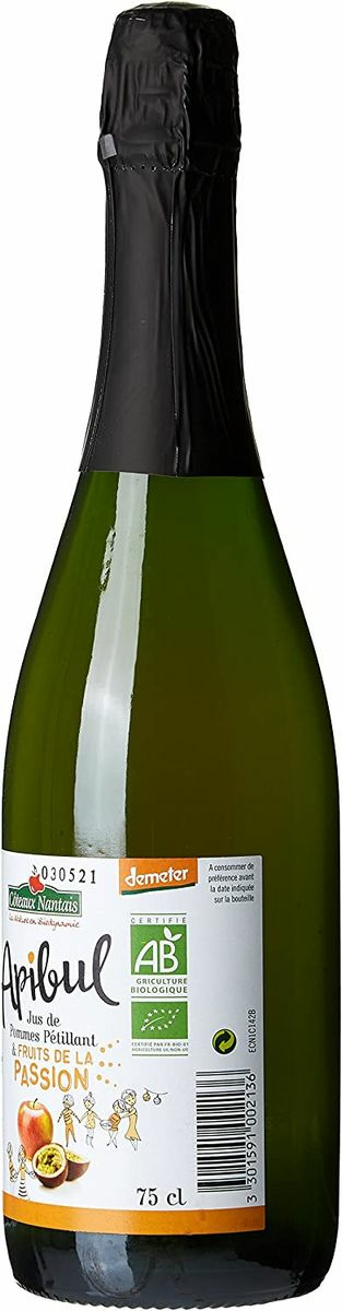 Un mélange tonique de jus de pommes et de fruits de la passion aux saveurs douces et exotiques parfaitement équilibrées. Un pétillant de fruits original pour vos apéritifs sans alcool. Bio européen. AB Agriculture Biologique. Déméter agriculture biodynamique.
