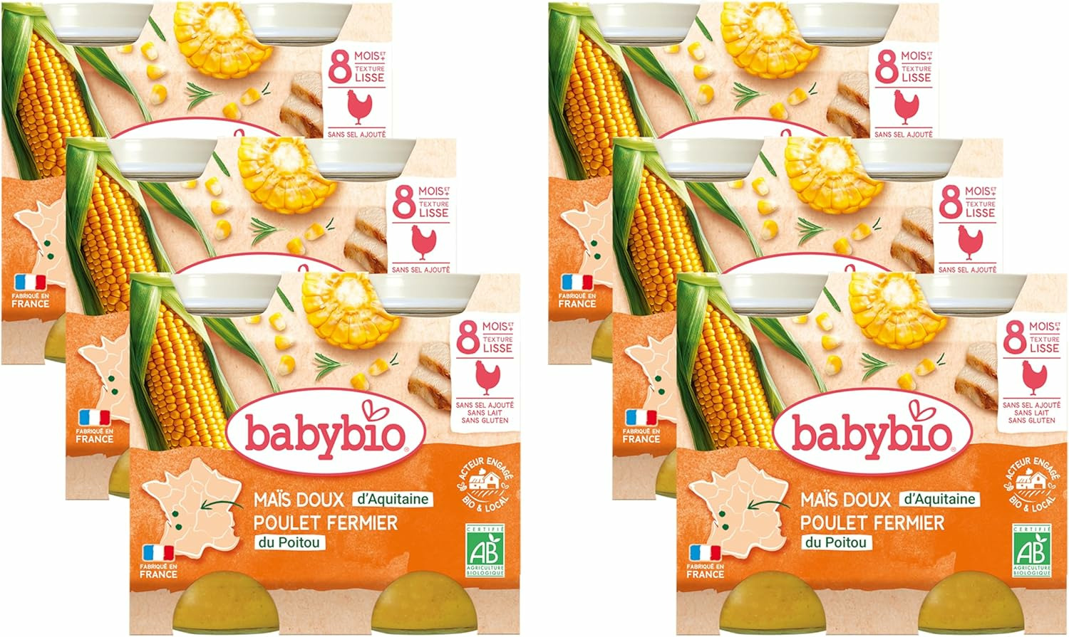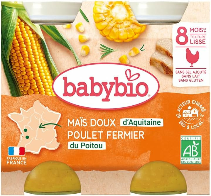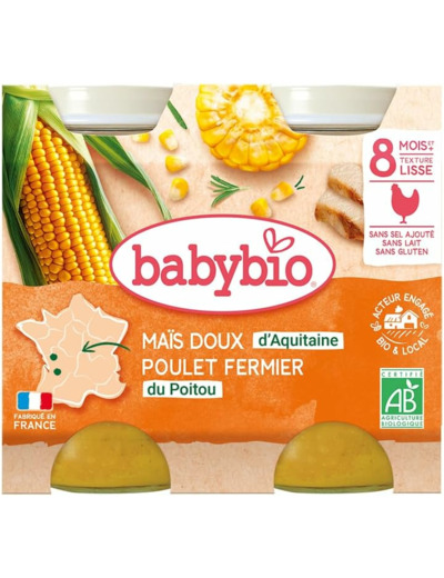 Un plat qui a la cot-cot-cot. Accompagné de maïs doux d'Aquitaine et de carottes des Landes, notre poulet du Poitou ravira les papilles des petits gourmets. Avec ce plat, bébé est sûr de se régaler. Sans sel ajouté. Sans épaississant. Sans gluten. Sans lait.
