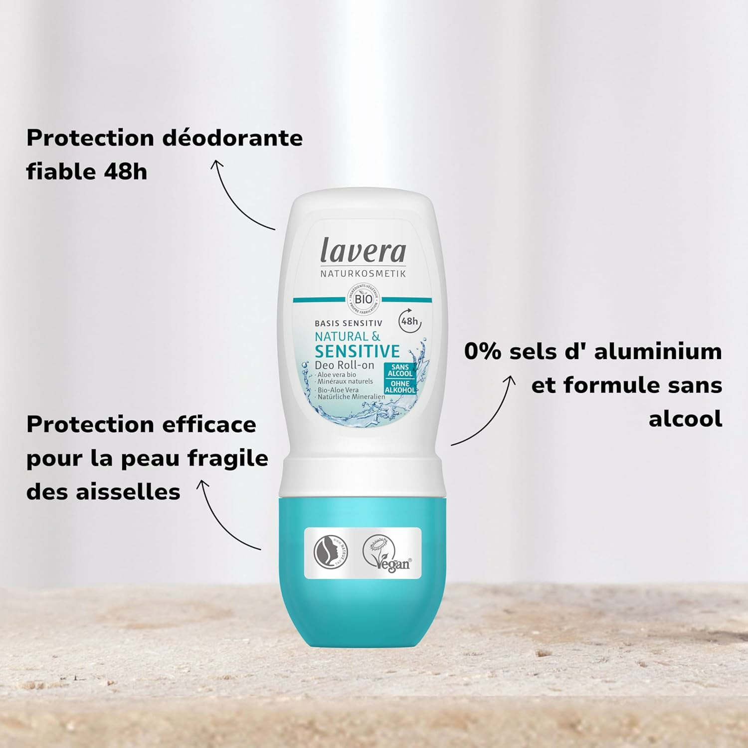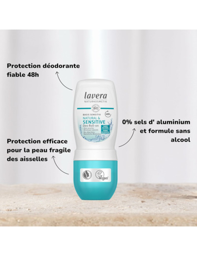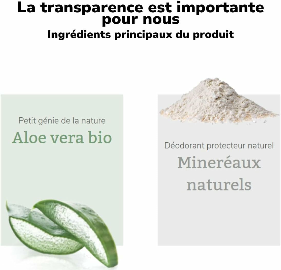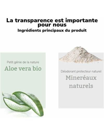 Déodorant pouvoir naturel 48h: protection efficace pour la peau fragile des aisselles grce à sa formule sans alcool particulièrement douce pour l’épiderme, même après le rasage. Notre composition d’actifs à base d’aloe vera bio et de minéraux naturels réduit la prolifération des bactéries responsables des mauvaises odeurs et prévient ainsi tout naturellement la formation d’odeurs de transpiration. Fraîcheur et protection fiable 48h sans aucun sel d’aluminium. La formule douce est douce pour la peau et bien tolérée. Avoir bonne conscience avec des cosmétiques naturels certifiés – sans faire de compromis. Nos promesses: - des cosmétiques naturels certifiés et testés sous contrôle dermatologique - des formules sans sels d’aluminium, sans alcool, sans parfums ni conservateurs synthétiques* - 96 % matière recyclée (bouteille & capuchon) « la vera », la vraie, s’engage pour la protection du climat et des animaux. *selon le règlement UE relatif aux produits cosmétiques.