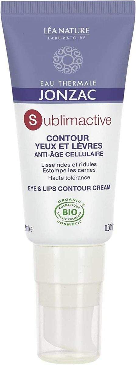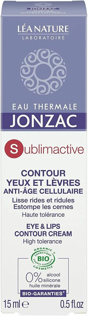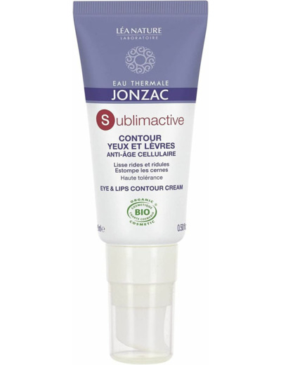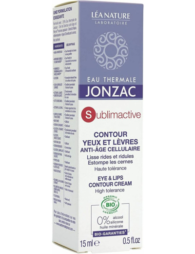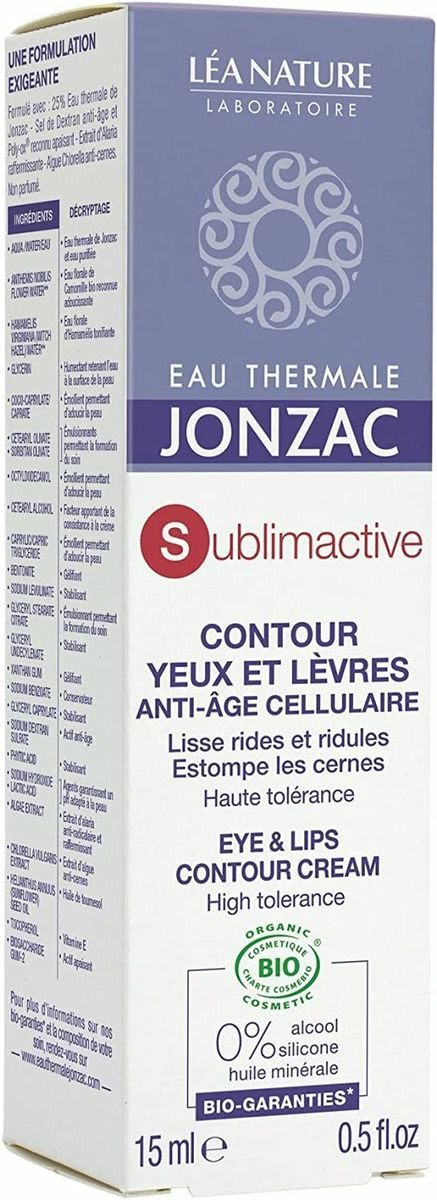 Certification: cosmebio.Pour prévenir des premiers signes du vieillissement cutané.La gamme Sublimactive combat le cercle vicieux inflammatoire grâce à l'eau thermale de Jonzac, qui associée au Sulfate de Dextran et au Poly-Ox, inhibe la libération des agents inflammatoire. L'extrait d'alaria active une barrière anti-radicalaire efficace. Le soin contour des yeux et lèvres est enrichi d'un extrait de chlorella à l'action anti-cernes démontrée. Il agit en prévention et correction des signes de vieillissement cutané sur le contour des yeux et des lèvres. Test d'efficacité (pastille rouge) Rides et ridules de la patte d'oie : 100% Contour des lèvres : 95% cernes : 96% Satisfaction mesurée - 22 sujets - 28 jours.Appliquer matin et soir sur le contour de l'oeil et des lèvres parfaitement démaquillés..Aqua / Water / eau*, Anthemis Nobilis Flower Water**, Hamamelis Virginiana (Witch Hazel) Water**, Glycerin, Coco-Caprylate/Caprate, Cetearyl Olivate, Sorbitan Olivate, Octyldodecanol, Silica, Cetearyl Alcohol, Magnesium Aluminum Silicate, Caprylic/Capric Triglyceride, Sodium Levulinate, Glyceryl Stearate Citrate, Glyceryl Undecylenate, Xanthan Gum, Sodium Benzoate, Glyceryl Caprylate, Sodium Dextran Sulfate, Helianthus Annuus (Sunflower) Seed Oil, Phytic Acid, Tocopherol, Algae Extract, Chlorella Vulgaris Extract, Sodium Hydroxide, Biosaccharide Gum-2, Lactic Acid. * Eau Thermale de Jonzac et eau **ingrédients issus de l'agriculture biologique.