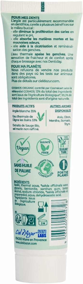 99% d'origine naturelle, certifié Bio Cosmos Organic : Plus de 99% du total des ingrédients des dentifrices Denticlay sont d'origine naturelle. Il sont composés à au moins 13% d'ingrédients issus de l'agriculture biologique. Tube de 75ml en PE Bio-sourcé issu de canne à sucre.