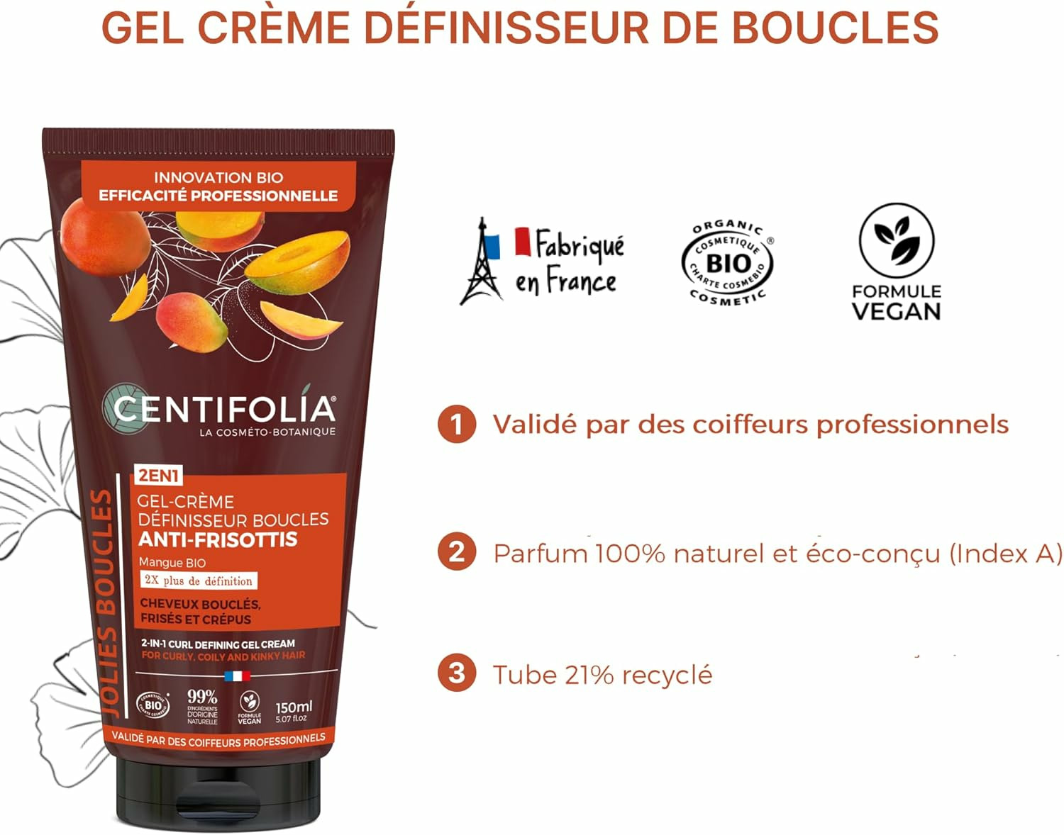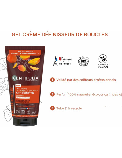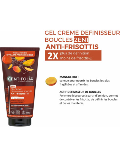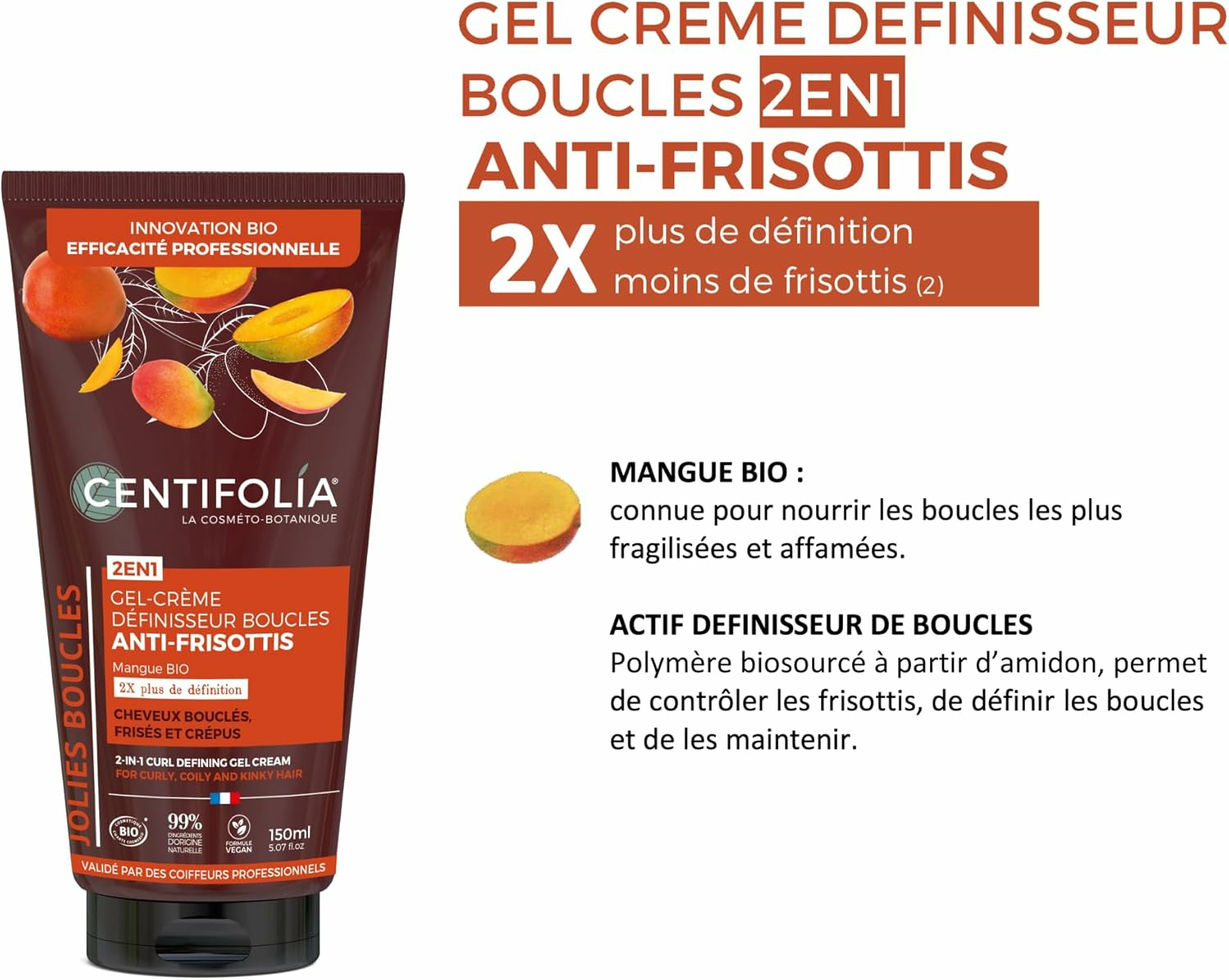 AVANTAGES & INGREDIENTS ACTIFS | Sa texture innovante associe la mangue bio, qui nourrit intensément les boucles fragilisées, à un actif définisseur biosourcé à base d’amidon. Ce polymère contrôle les frisottis, définit les boucles et les maintient souples de la racine à la pointe.