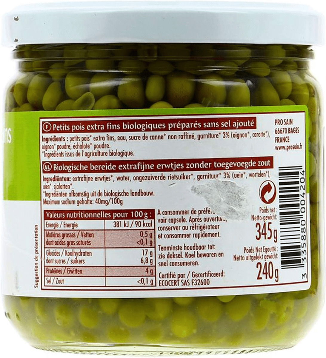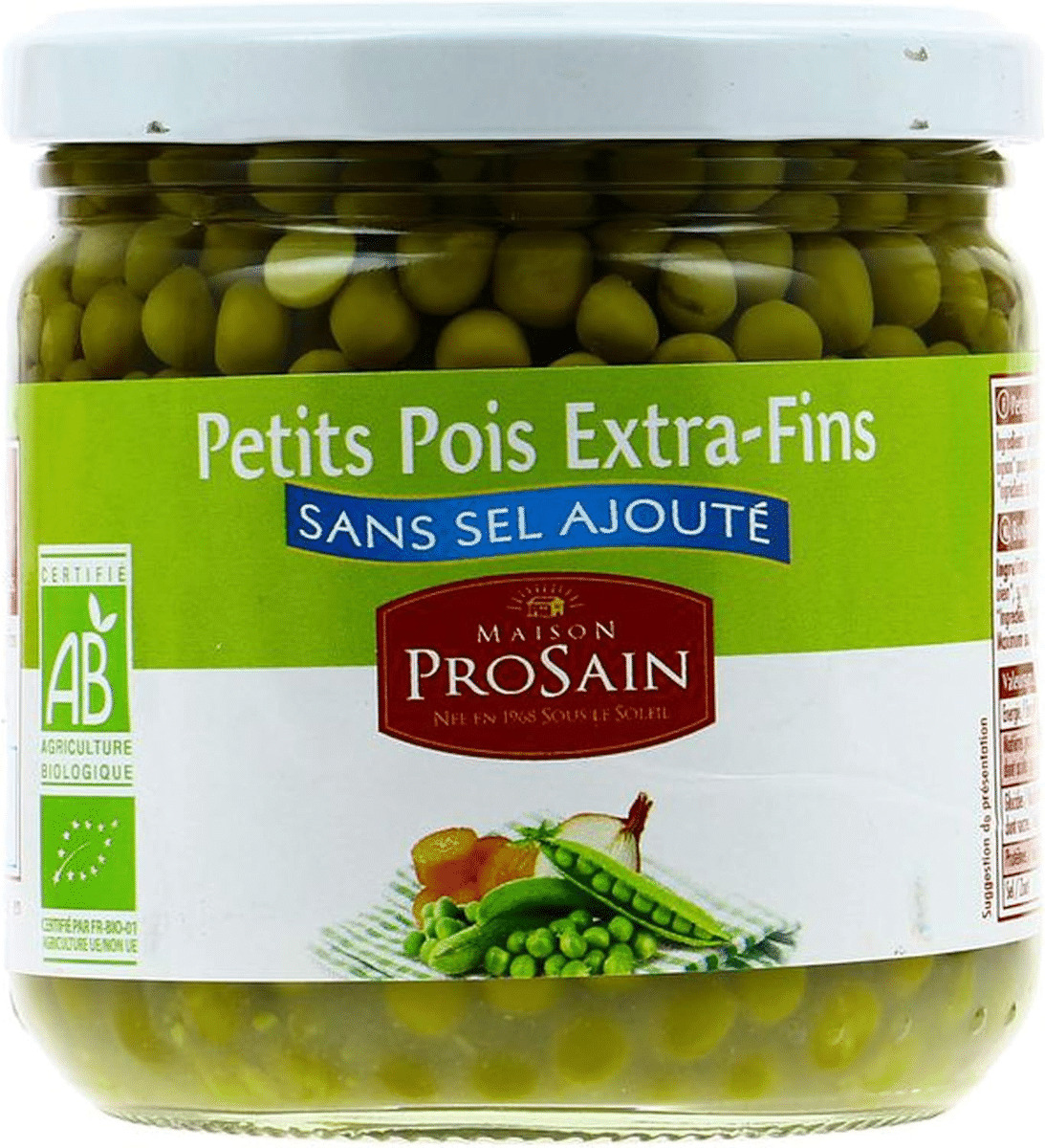 Petit Pois sans sel ajouté 345G Bio Pour votre santé, pratiquez une activité physique régulière. Prosain