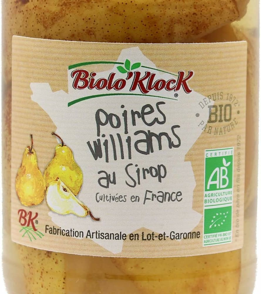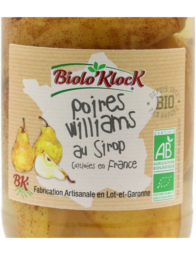 DESCRIPTION: Nos poires au sirop, 100% françaises, sont divisées en quartiers et conditionnées dans un bocal en verre recyclable de 370 grammes. Ce produit est idéal pour agrémenter vos créations culinaires en dehors des saisons fruitières. Les salades de fruits, pâtisseries diverses, smoothies, recettes salées, fromages n’en seront que plus variés et plus savoureux. Tous nos fruits au sirop sont préparés artisanalement, à l’ancienne (la mise en pot s’effectue à la main), en petites quantités, par des passionnés du BIO, du respect de l’environnement et de la santé; un héritage familial transmis de génération en génération avec une profonde conviction. COMPOSITION: Ingrédients : Quartiers de poires* Williams françaises immergées dans leur sirop (ajout d'eau et de 20 % de sucre* de canne) Aucun autre rajout d’aucune sorte. *Ingrédients issus de l’agriculture biologique. ORIGINE PRODUIT: FRANCE CONDITIONNEMENT: Bocal en verre recyclable de 370g net FABRICATION: Nos fruits au sirop sont fabriqués de façon traditionnelle, comme à la maison. Après avoir été soigneusement sélectionnés selon leurs qualités gustatives et cueillis à maturité gorgés de soleil, les fruits sont mis en pot manuellement. Un maximum de nos fruits proviennent des vergers familiaux aux pieds desquels BIOLO’KLOCK est installée, au cœur du Lot et Garonne. Ces arbres fruitiers sont cultivés en BIO depuis des dizaines et des dizaines d’années. Ils ont soigneusement été sélectionnés en fonction de leur variété; les variétés anciennes étant réputées pour la qualité de la saveur de leurs fruits. SAVEURS ET BIENFAITS: Savourez nos poires au sirop BIO 100% françaises qui vous offrent, sans compter, leur savoureux parfum fruité. La poire est une excellente source de fibres, d’antioxydants, de Vitamines. (Ces vertus que l'on attribue à chacun de ces fruits sont reconnues depuis des générations mais ne sauraient se substituer à un traitement prescrit par un professionnel de la santé.) CONSEILS: A conserver au frais après ouverture. LE SAVIEZ-VOUS?: La tradition rapporte que les souverains venant se faire sacrer dans la Cathédrale Notre-Dame de Reims, recevaient en cadeau une poire et une coupe de champagne.