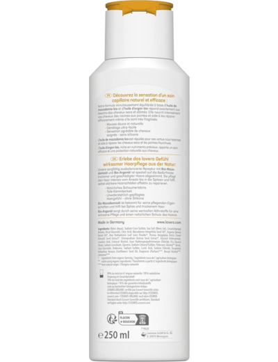 Naturellement efficaces - Découvrez le secret des soins capillaires de lavera: Naturelle et minutieusement équilibrée, notre composition à base d’huile de macadamia bio aux propriétés nourrissantes et de quinoa bio, offre un soin intense aux cheveux fatigués et fragilisés - des racines jusqu’aux pointes. Elle aide même à réparer efficacement les cheveux très abîmés. La formule de soin innovante procure une mousse particulièrement légère et facilite nettement le démêlage. Découvrez une nouvelle dimension de la souplesse et du soin naturel, sans aucun silicone. Avoir bonne conscience avec des cosmétiques naturels certifiés - sans faire de compromis. Nous vous promettons: d’utiliser des formules s et de renoncer aux silicones, aux microplastiques à l’état solide ou liquide ainsi qu'aux colorants et conservateurs artificiels, des compositions naturelles qui ont été composées harmonieusement et en exclusivité par la recherche de lavera avec les meilleurs actifs d'origine naturelle assortis finement les uns aux autres, des cosmétiques naturels qui ont été certifiés par des institutions indépendantes et testés sous contrôle dermatologique, que cet emballage est constitué à 93 % de matière recyclée, d’être une entreprise à l'impact neutre pour le climat. ( la vera ), la vraie, s’engage pour la protection du climat et des animaux. selon le règlement UE relatif aux produits cosmétiques ClimatePartner/12310-1610-1001.