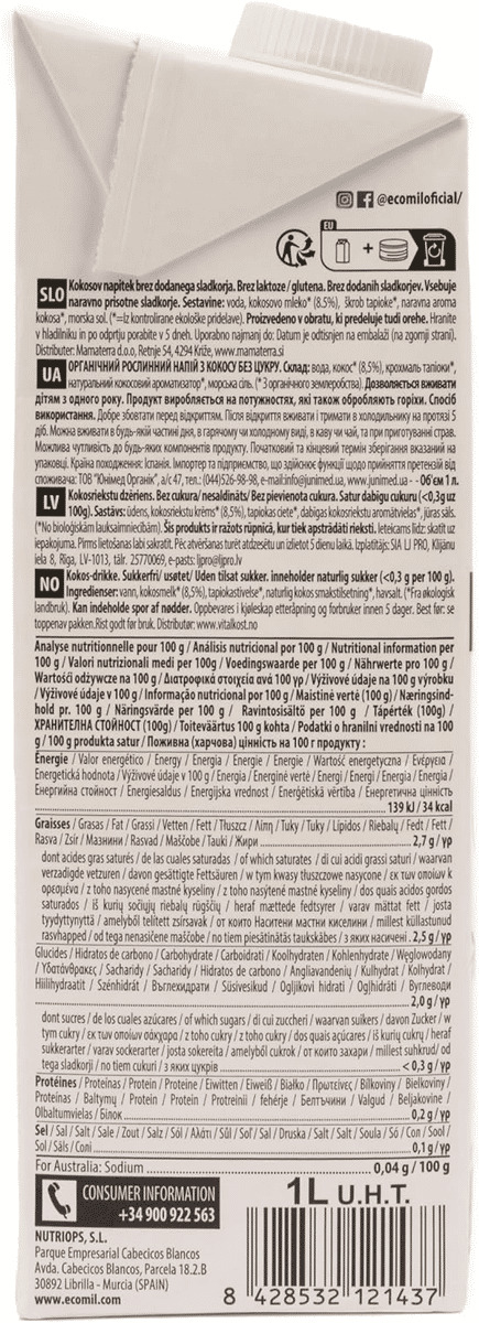ECOMIL Boisson coco nature sans sucres et sans gluten 1L Bio -