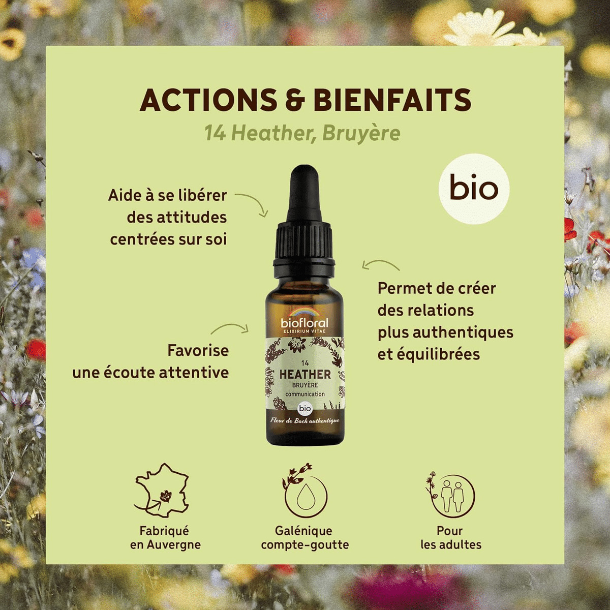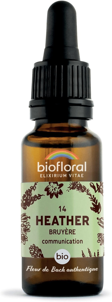 Fondé par Ulrich Rampp en 1979, le laboratoire Biofloral se consacre à la fabrication artisanale de remèdes naturels certifiées 100 % BIO dont le célèbre élixir du Suédois, l’Ortie-Silice ou encore les Fleurs de Bach Vous arrive-t-il souvent de vous retrouver centré sur vous-même, éprouvant des difficultés à véritablement écouter et comprendre les personnes autour de vous ? La Fleur de Bach 14 Heather - Bruyère en granules bio de Biofloral vous aide à sortir de votre bulle, pour que vous puissiez redécouvrir le plaisir de parler avec les autres, en faisant preuve d'une gentillesse véritable • Aspire à vous reconnecter avec votre entourage • Favorise l'ouverture d'esprit • Libère des entraves de l'égocentrisme, ouvrant la voie à une vie plus équilibrée et joyeuse La Fleur de Bach 14 Heather - Bruyère est également disponible en format granules sans alcool