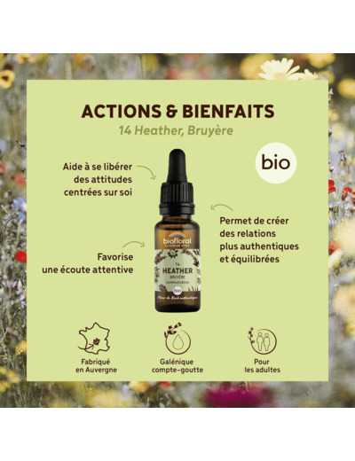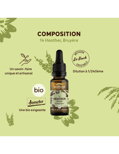 Fondé par Ulrich Rampp en 1979, le laboratoire Biofloral se consacre à la fabrication artisanale de remèdes naturels certifiées 100 % BIO dont le célèbre élixir du Suédois, l’Ortie-Silice ou encore les Fleurs de Bach Vous arrive-t-il souvent de vous retrouver centré sur vous-même, éprouvant des difficultés à véritablement écouter et comprendre les personnes autour de vous ? La Fleur de Bach 14 Heather - Bruyère en granules bio de Biofloral vous aide à sortir de votre bulle, pour que vous puissiez redécouvrir le plaisir de parler avec les autres, en faisant preuve d'une gentillesse véritable • Aspire à vous reconnecter avec votre entourage • Favorise l'ouverture d'esprit • Libère des entraves de l'égocentrisme, ouvrant la voie à une vie plus équilibrée et joyeuse La Fleur de Bach 14 Heather - Bruyère est également disponible en format granules sans alcool