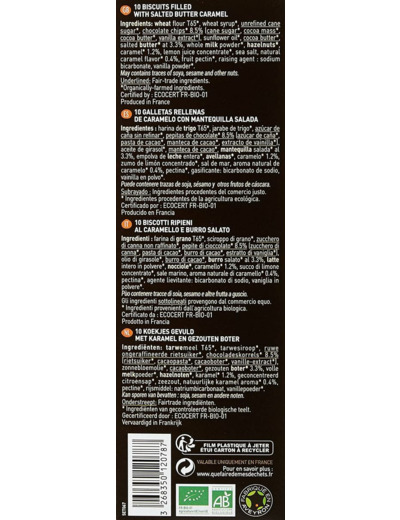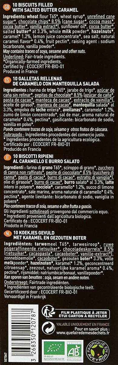 Farine de BLÉ T65*, sirop de BLÉ*, sucre de canne non raffiné*, pépites de chocolat* 8.5% (sucre de canne*, pâte de cacao*, beurre de cacao*, extrait de vanille*), huile de tournesol*, beurre de cacao*, beurre salé à 3.3%*, poudre de lait entier*, NOISETTES*, caramel* 1.2%, jus de citron concentré*, sel de mer, arôme naturel de caramel* 0.4%, pectine*, poudre à lever: bicarbonate de sodium, poudre de vanille*. Peut contenir des traces de soja, SÉSAME et fruits à coque. Souligné: ingrédients issus du commerce équitable. *Ingrédients issus de l’agriculture biologique.