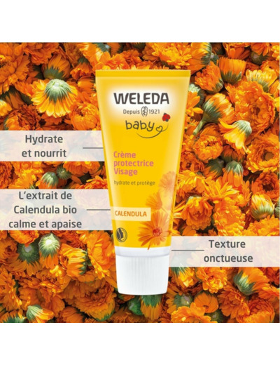 Soin quotidien hydratant, la Crème protectrice Visage au Calendula prévient le dessèchement de la peau et soutient ses fonctions naturelles. Elle protège efficacement la peau de bébé et des jeunes enfants contre les agressions climatiques (vent, froid).