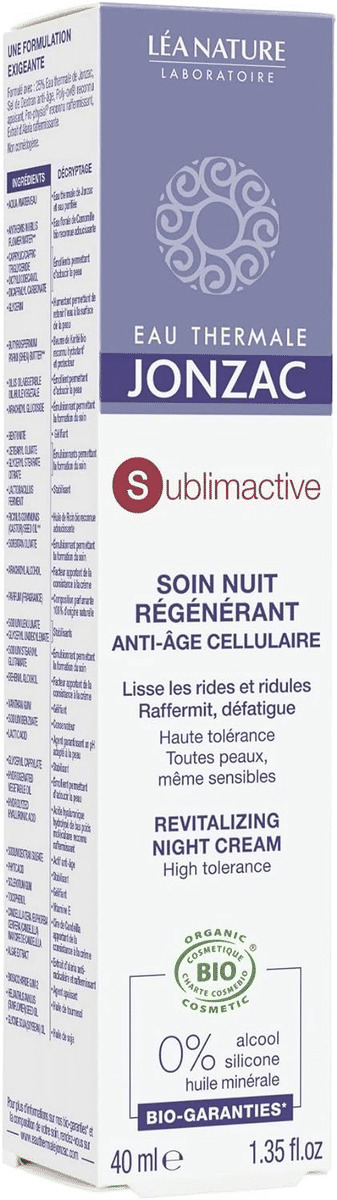 La crème de nuit anti-âge cellulaire fonctionne comme un complément à votre soin sublimactif de jour grâce à la pro-physique qui prolonge la biosynthèse du Pro-Collagène pendant la nuit, le meilleur moment pour la régénération de la peau. Le matin, la peau est lissée, énergisante et revitalisée. Formulé et testé pour minimiser le risque de réactions allergiques. Formulé avec 25 % d'eau de source thermale Jonzac, sels de dextran, poly-ox, pro-physique connu pour ses vertus raffermissantes, extrait d'alaria (algues brunes). Testé dermatologiquement. Les produits Jonzac sont des soins de la peau biologiques et hypoallergéniques qui correspondent étroitement à la structure de chaque peau, même les peaux sensibles. Une formulation biomimétique utilise de l'eau de source thermique isotonique. Les formules bio parfaitement compatibles avec la peau. Soutien du club « 1% for the planet » : 1% du total des ventes de ses marques bio au financement de projets de préservation de l'environnement.