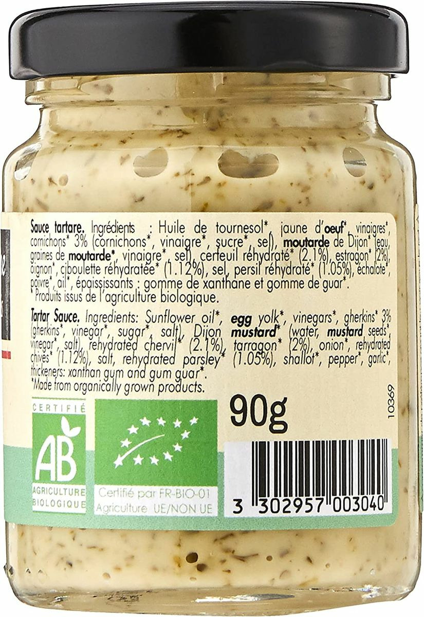 Sauce tartare, bio.Ingrédients : Huile de tournesol * , jaune d'oeuf* , vinaigres* , cornichons* 3% (cornichons*, vinaigre*, sucre*, sel), moutarde de Dijon* (eau , graines de moutarde*, vinaigre*, sel), cerfeuil réhydraté* (2,1%), estragon* (2%), oignon*, ciboulette réhydratée* (1,12%), sel, persil réhydraté* (1,05%), échalote*, poivre*, ail*, épaississants : gomme de xanthane et farine de graine de guar.* produits issus de l'agriculture biologique.