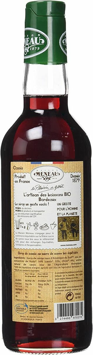 Sucre de canne roux d'Amérique du Sud**, eau, jus concentrés de fruits* 16% (12% de cassis*, 4% de citron*), arôme naturel de cassis*. *100% des ingrédients agricoles issus de l’agriculture biologique, et **94% du Commerce Equitable.