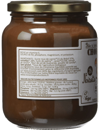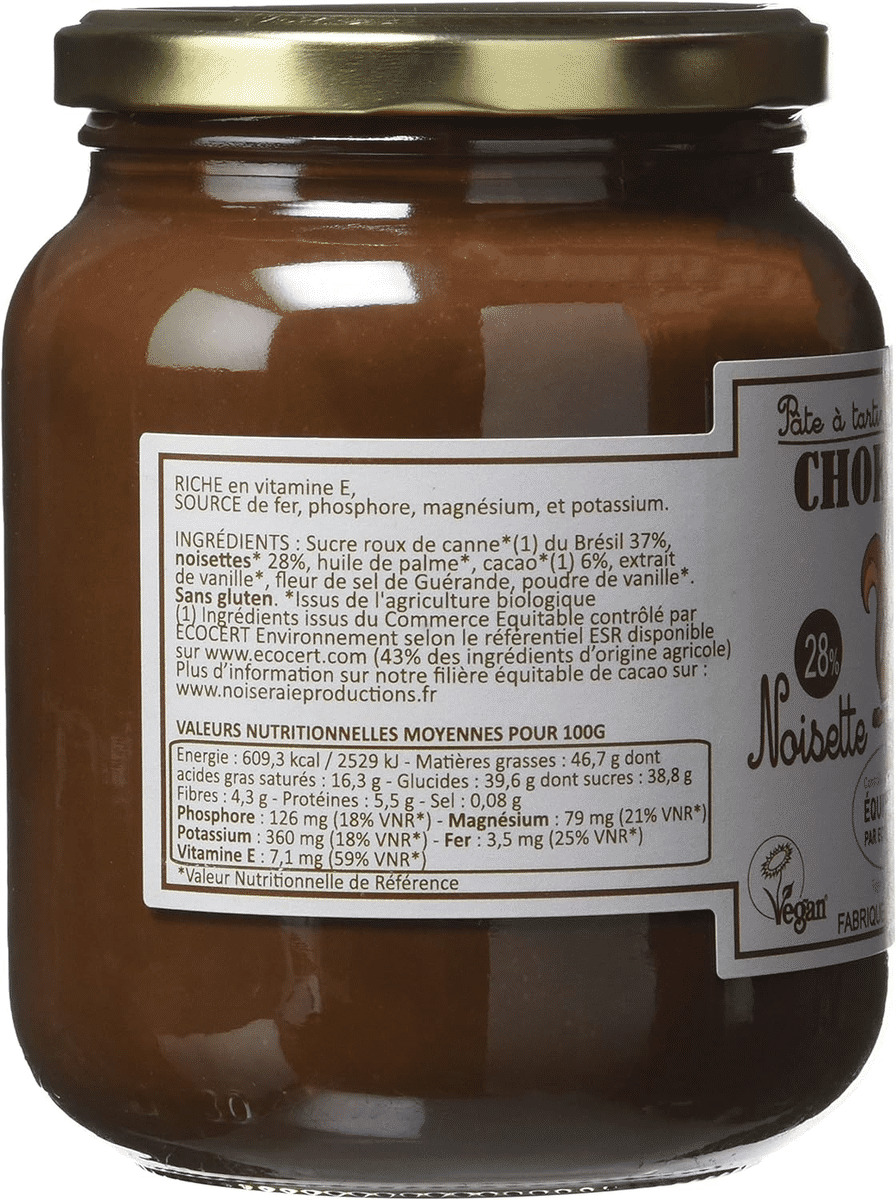 Sucre de canne roux*(1) du Brésil 37%, noisettes* 28%, huile de palme*, cacao*(1) 6%, extrait de vanille*, fleur de sel de Guérande, poudre de vanille*. *ingrédients issus de l’agriculture biologique Peut contenir des traces d’autres fruits à coques. (1) Ingrédients issus du Commerce Equitable contrôlé par Ecocert Environnement selon le référentiel ESR.
