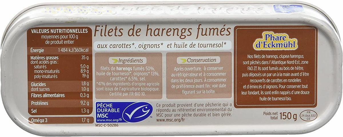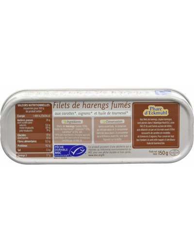 Filets de HARENGS fumés 50 %, huile de tournesol*, oignons* 13 %,carottes* 6,5 %, sel.