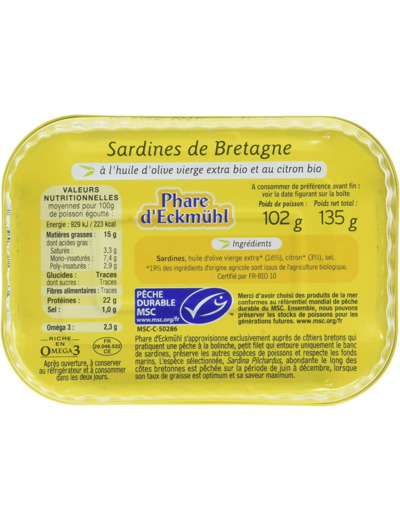 Ingrédients : SARDINES (Sardina pilchardus), huile d'olive vierge extra* 16%, citron* 3%, sel. *19% des ingrédients d'origine agricole sont issus del'agriculture biologique. Certifié par FR-BIO 10.