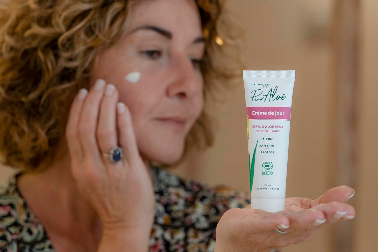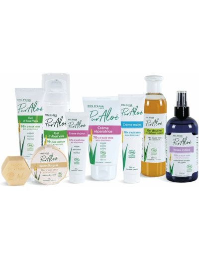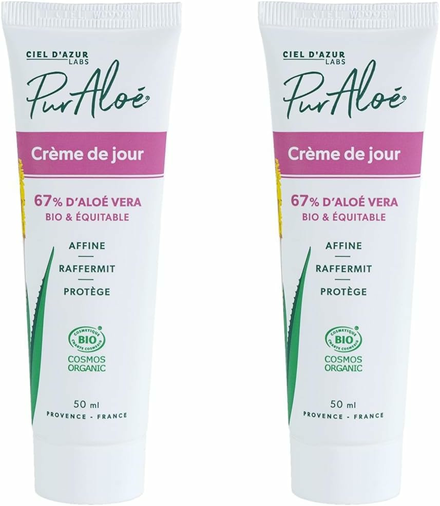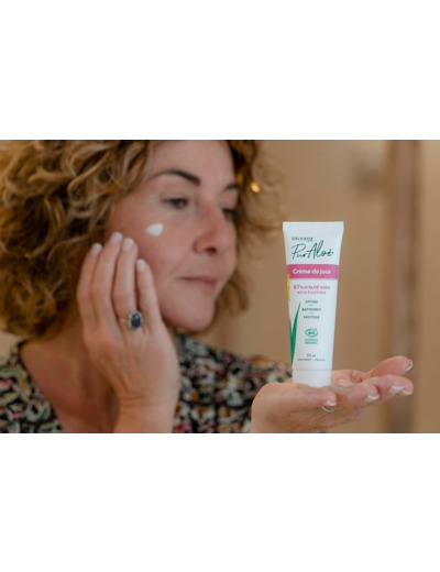 Crème de jour Bio à la pulpe fraîche de feuilles d'Aloé : La crème de jour Pur Aloé, hydratante, est idéale en base à votre maquillage. Elle atténuera les cernes grâces à l'effet lissant de l'Aloé. Non issue de poudre mais bien de jus d’Aloé Natif, Bio et équitable, notre crème est riche en polysaccharides, vitamines et minéraux. La crème est Vegan, formulée sans eau ajoutée. Elle convient à tous types de peaux.