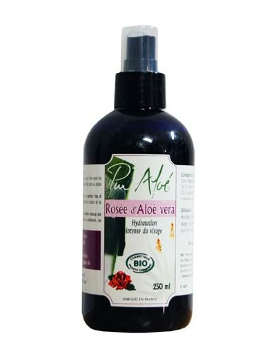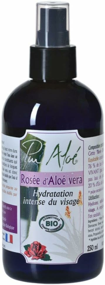 98,9% du total des ingrédients de la Rosée d'Aloé sont d'origine naturelle. Elle est composée à 76% de jus d'Aloé vera Bio natif, sans poudre et en Commerce Équitable, et de 20% d'eau de rose Bio. 96% du total des ingrédients sont issus de l'agriculture Biologique, soit 4,9 fois plus que les 20% minimum demandés par la cosmétique Bio ! Flacon pompe de 250ml.