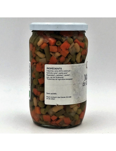 Ingrédients : légumes verts 50% minimum: haricots verts*, petits pois*, flageolets*, carottes*, navets*, eau, sel de Guérande . *Produit issu de lagriculture biologique - Sans additifs - Peut contenir des traces de céleri.