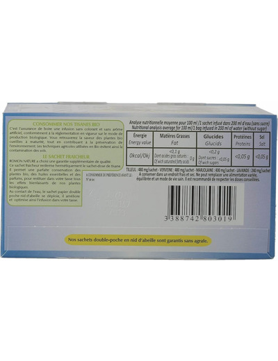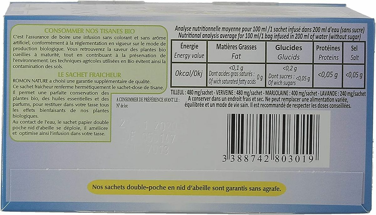Tisane issue de l'agriculture biologique. Composition : Tilleul , marjolaine, verveine, lavande. Conditionnement : boite de 20 sachets. Reconnue pour ses propriétés apaisantes, la fleur de tilleul est conseillée pour le détendre et favoriser l'endormissement.