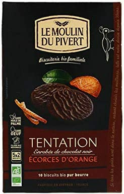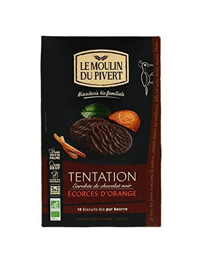 Biscuits aux écorces d'orange confites, enrobés de chocolat noir, sans huile de palme. Biscuits Tentation chocolat noir aux écorces d'orange 130G Bio Pour votre santé, évitez de manger trop gras, trop sucré, trop salé. Moulin Du Pivert