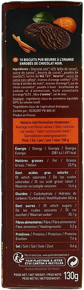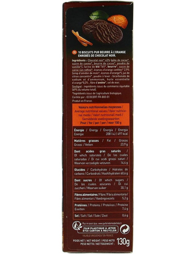 Chocolat noir*42% (pâte de cacao*, sucre de canne*, beurre de cacao*, poudre de vanille*), farine de blé T65*, sucre de canne non raffiné*, huile de tournesol*, beurre de cacao*, écorces d orange confites* 2.9% (sirop d amidon de maïs*, écorces d orange*), jus de citron concentré*, poudre à lever : bicarbonate de sodium et d ammonium, huile essentielle d orange* 0.3%, fibre d avoine*, sel de mer. Souligné : ingrédients issus du commerce équitable. (49% du volume total). *Ingrédients issus de l agriculture biologique. Les informations en gras sont destinées aux personnes intolérantes ou allergiques. Valeurs nutritionnelles pour 100g : Energie : 2081 kJ / 497 kcal Matières grasses : 23,9g Dont acides gras saturés : 14,4g Glucides : 60,6g Dontsucres : 30,1g Fibres : 5,2g Protéines : 7,4g Sel : 0,6g Allergènes : Soja, Blé, Beurre