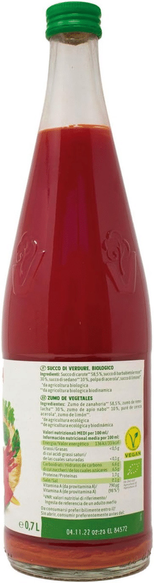 Pur jus de betteraves rouges* (56%), pur jus de carottes* (20%), pur jus de céleri* (20%), pur jus de radis* (4%), purée d'acerola* (1%), ferments lactiques (L+). *Issus de l'Agriculture Biologique et Biodynamie. Valeurs nutritionnelles pour 100ml :Energie : 134 kJ / 32 kcal Protides: 1g Glucides : 6g Dont sucres : 5,5g Fibres: 0,23g Sel : 0,0g Vitamine C: 10mg