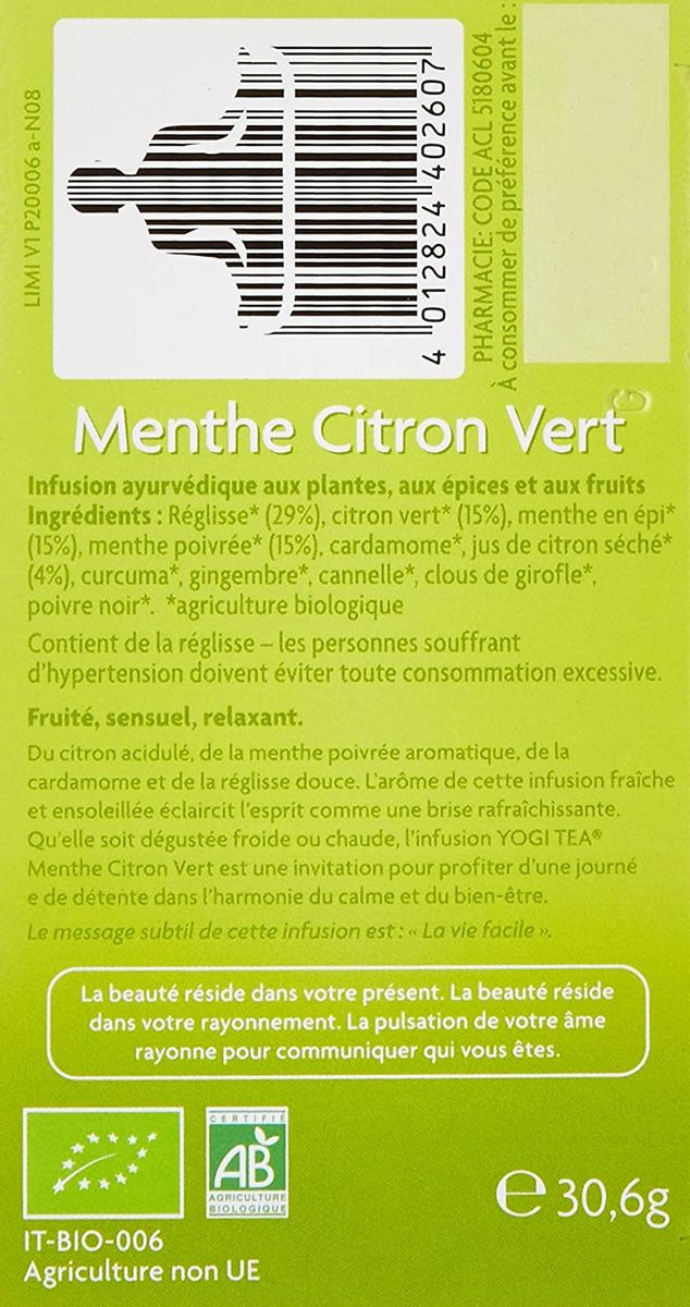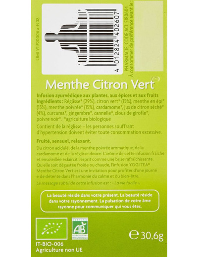 Tisane Ayurveda Menthe Citron 17X1,8G Yogi Tea