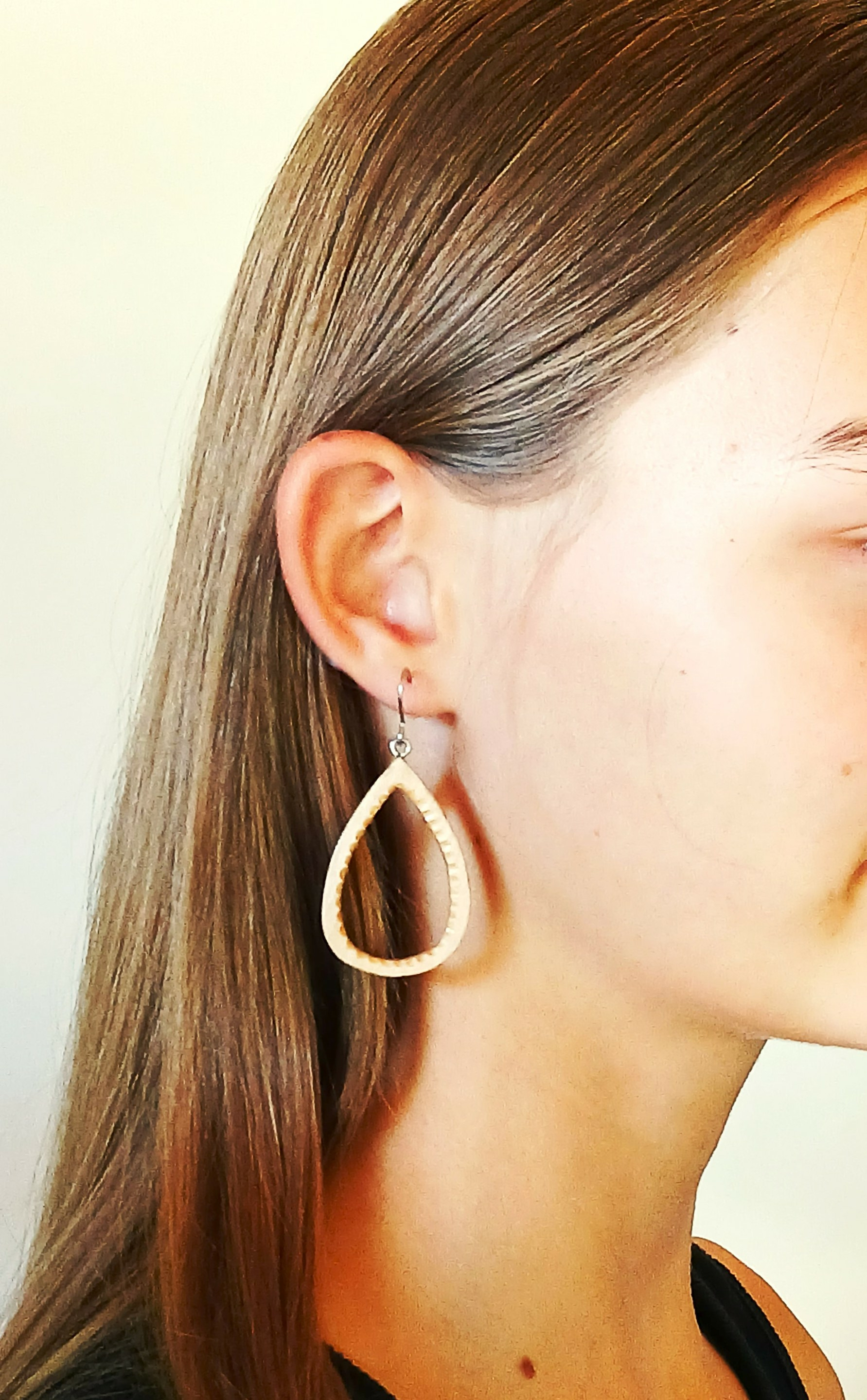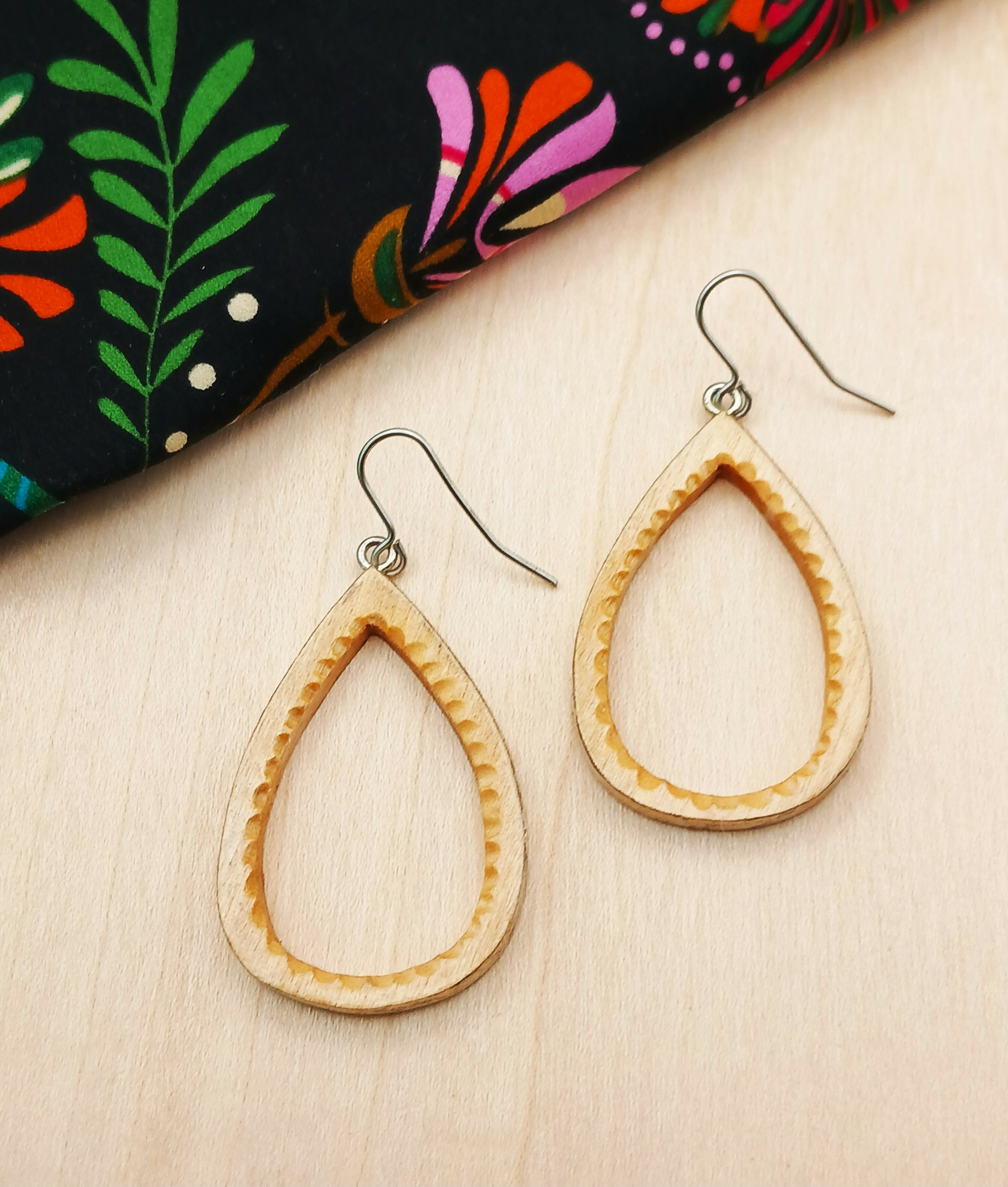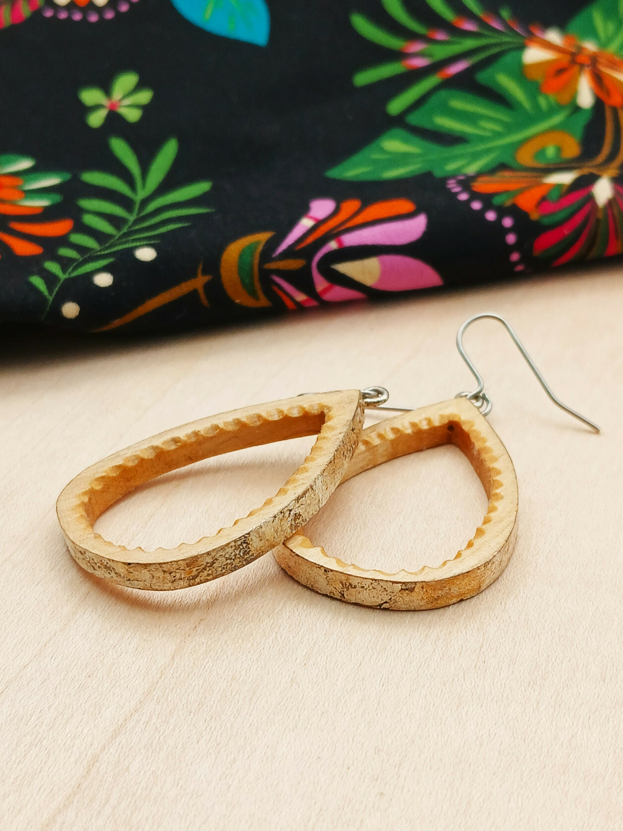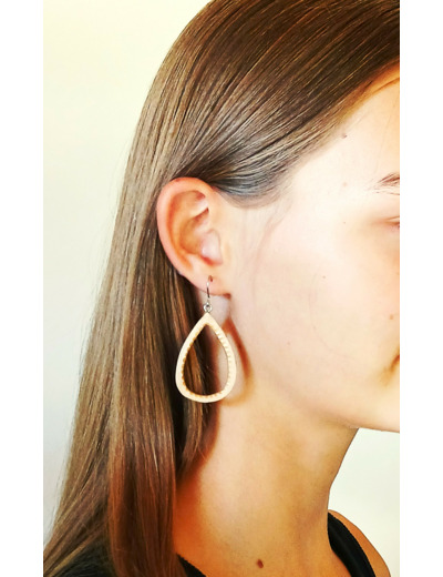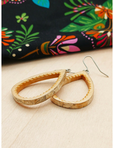 Paire de boucles d’oreilles en Erable, très légère et délicatement ornées d’une feuille d’argent 925/1000 sur le tour extérieur. Montées sur fil crochet en Acier Chirurgical.