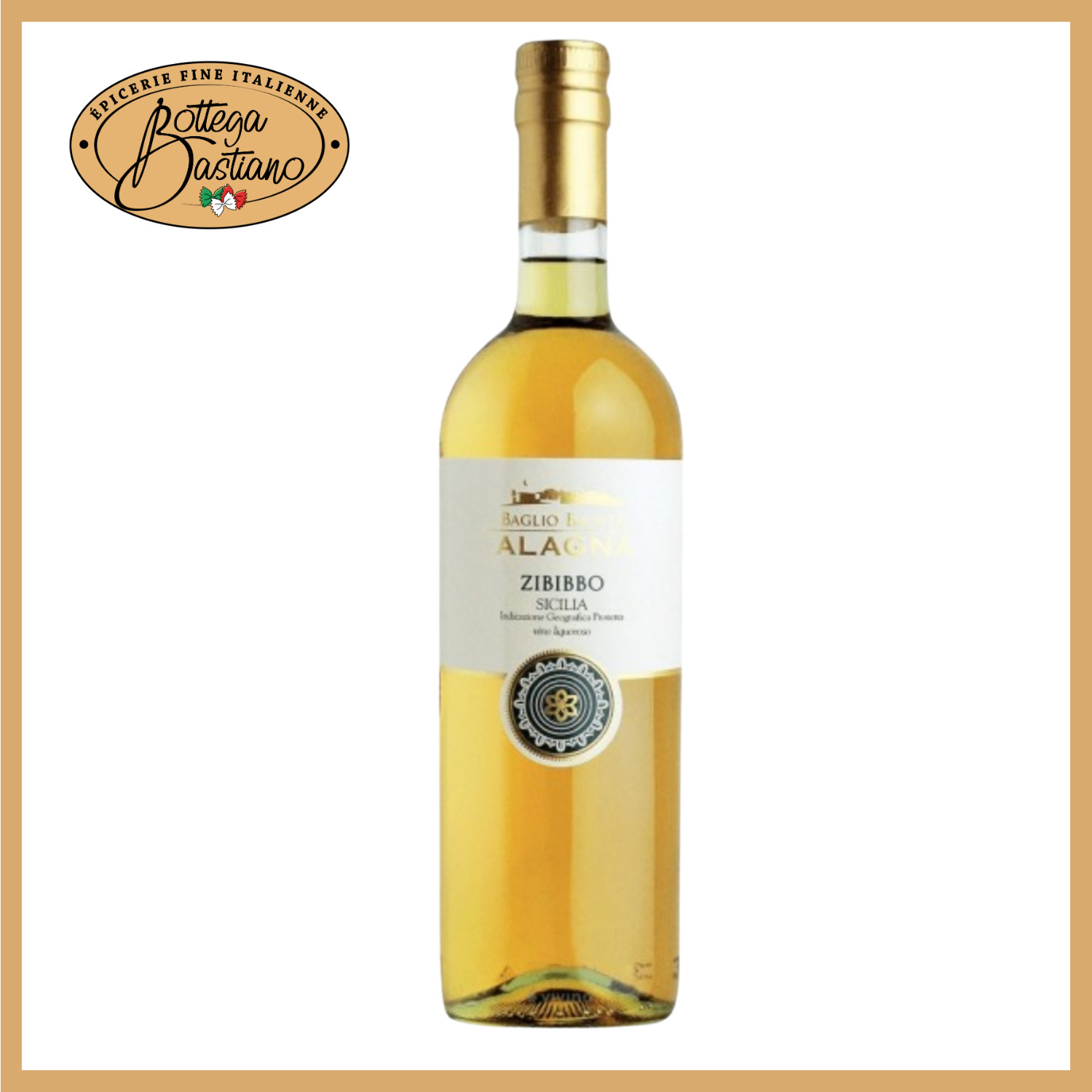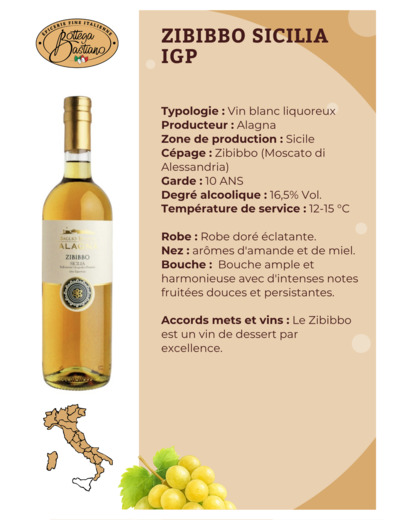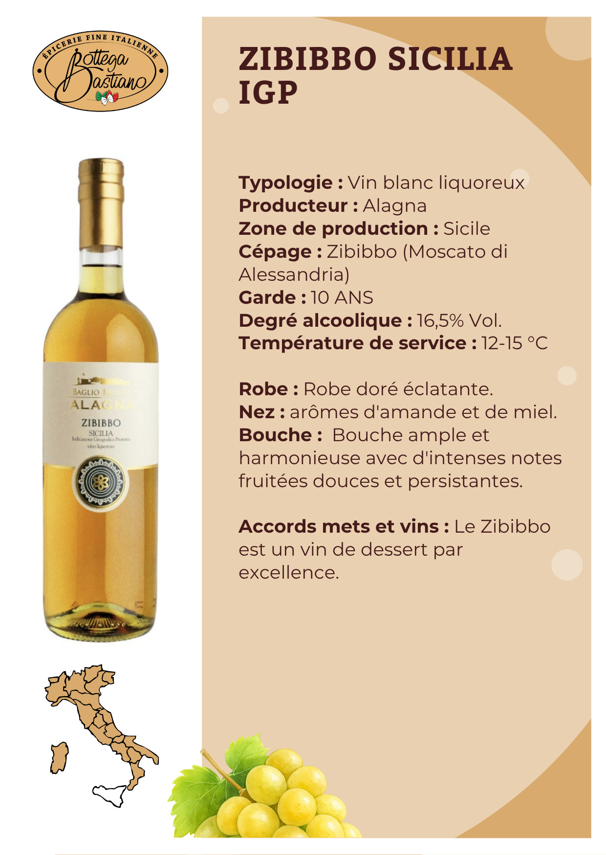 Le Zibibbo est une variété de raisin originaire d’Egypte et cultivée principalement en Sicile. Le nom Zibibbo vient du mot arabe zabib qui signifie justement "raisin sec", comme traditionnellement est vinifié. Ce Vin blanc liquoreux peut se consommer en apéritif (à servir très frais !) ou en vin de dessert en accompagnement de pâtisseries siciliennes, comme les cannoli.